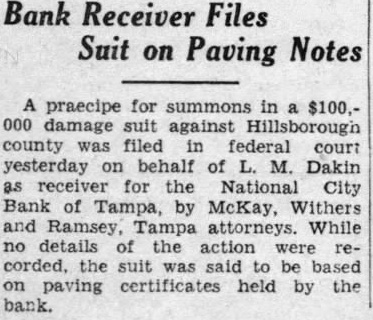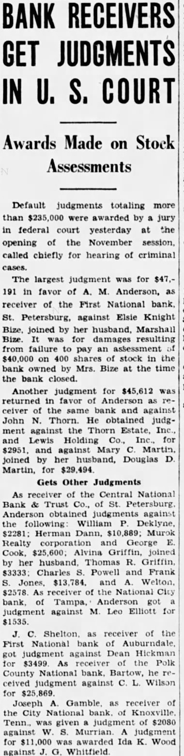 BANK RECEIVERS GET JUDGMENTS IN U. S. COURT Awards Made on Stock Assessments Default judgments totaling more than $235,000 were awarded by jury in federal court yesterday at the opening of the November session, called chiefly for hearing of criminal cases. The largest judgment was for $47,191 in favor of M. Anderson, as receiver of the First National bank. St. Petersburg, against Elsie Knight Bize, joined by her husband, Marshall Bize. for damages resulting from pay an assessment $40,000 400 stock in the bank owned by Mrs. Bize at the time the bank closed. Another judgment for $45,612 was returned in favor Anderson ceiver the same bank and against John N. Thorn. He obtained judgment against the Thorn Estate, Inc., and Lewis Holding Co., Inc., for $2951, and against Martin. joined by husband, Douglas D Martin, for $29,494 Gets Other Judgments As receiver of the Central National Bank Trust of St. Petersburg. Anderson obtained judgments against the following William Deklyne, $2281: Herman Dann, $10,889; Murok Realty corporation George E. Cook, $25,600; Alvina Griffin, joined by her husband, Thomas R. Griffin, $3333: Charles Powell and Frank Jones, $13,784. and Welton. $2578. receiver of the National City bank, Tampa, Anderson got judgment against M. Leo Elliott for $1535. C. Shelton receiver of the First National bank of Auburndale got judgment against Dean Hickman $3499 As Polk County National bank. Bartow, ceived judgment against Wilson for $25,869 Joseph Gamble, receiver of the City National Tenn., given judgment of $2080 against W. Murrian judgment for was awarded Ida K. Wood against J. G. Whitfield