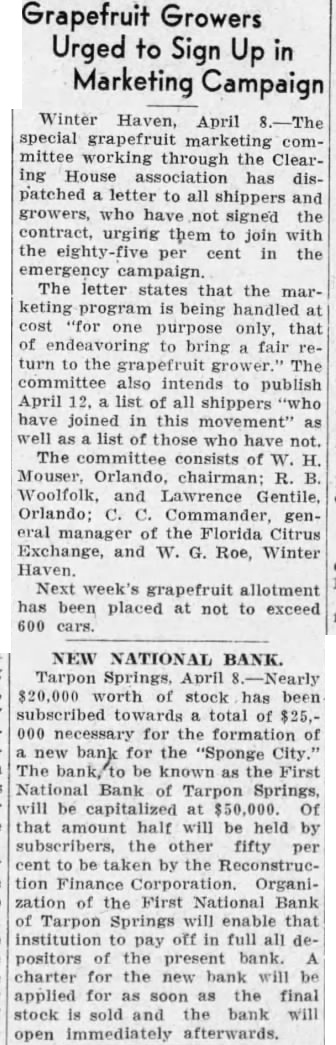 Grapefruit Growers Urged to Sign Up in Marketing Campaign Winter Haven, April special grapefruit marketing mittee working through the Clearing House dispatched letter all shippers and growers, signed the contract, urging them join with the cent in the The letter states the keting program being handled purpose that of endeavoring bring fair turn grapefruit committee intends publish April list all shippers have joined this movement" who have not. The committee consists Mouser, Orlando, chairman: Woolfolk, Lawrence Gentile. Commander, the Florida Citrus Exchange, and W. Roe, Winter Haven. Next week's allotment been placed at not exceed 600 cars. NEW NATIONAL BANK. stock has subscribed 000 the new bank for "Sponge known First National Bank Springs, that will held subscribers, other fifty per by the tion Organization First National Bank Tarpon Springs will enable institution pay off in full all positors present bank. charter for the bank will applied soon the stock bank immediately afterwards.