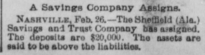 A Savings Company Assigns. NASHVILLE, Feb. 26.-The - Sheffield (Ala.) Savings and Trust Company bas assigned. The deposits are $20,000. The assets are said to be above the liabilities.