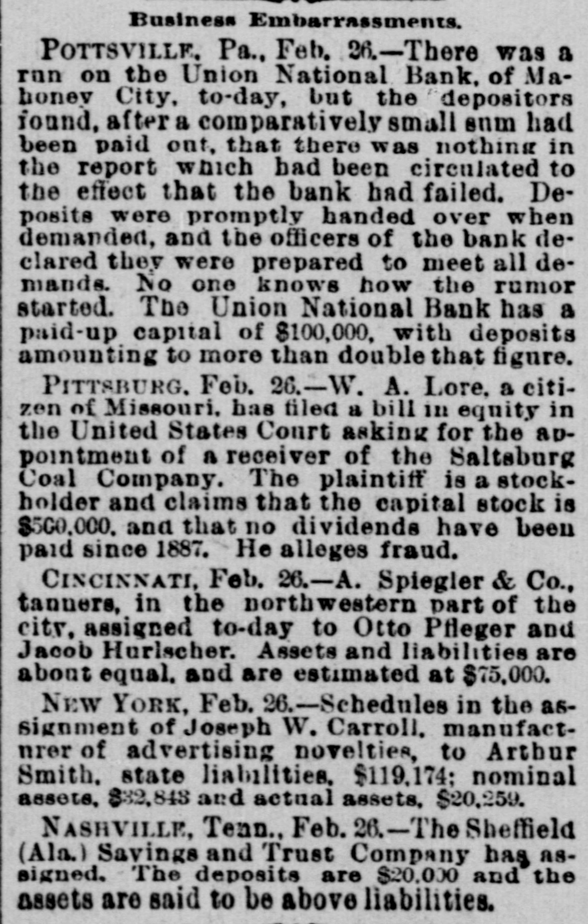 Business Embarrassments. POTTSVILLE. Pa., Feb. 26.-There was a run on the Union National Bank, of Mahonev City, to-day, but the depositors found, after a comparatively small sum had been paid ont, that there was nothing in the report which bad been circulated to the effect that the bank had failed. Deposits were promptly handed over when demanded, and the officers of the bank declared they were prepared to meet all demands. No one knows how the rumor started. The Union National Bank has a paid-up capital of $100,000, with deposits amounting to more than double that figure. PITTSBURG. Feb. 26.-W. A. Lore, a citizen of Missouri, has filed a bill in equity in the United States Court asking for the appointment of a receiver of the Saltsburg Coal Company. The plaintiff is a stockholder and claims that the capital stock is $500,000. and that no dividends have been paid since 1887. He alleges fraud. CINCINNATI, Feb. 26.-A. Spiegler & Co., tanners, in the northwestern part of the city, assigned to-day to Otto Pfleger and Jacob Hurlscher. Assets and liabilities are about equal. and are estimated at $75,000. NEW YORK, Feb. 26.-Schedules in the assignment of Joseph W. Carroll, manufactnrer of advertising novelties, to Arthur Smith. state liabilities, $119,174; nominal assets, $32,848 and actual assets, $20,259. NASHVILLE, Tenn., Feb. 26.-The Sheffield (Ala.) Savings and Trust Company has assigned. The deposits are $20,000 and the assets are said to be above liabilities.
