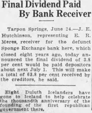 Final Dividend Paid By Bank Receiver Tarpon Springs, June Hutchinson, representing E. R. Meres, receiver for defunct Sponge Exchange bank here, which closed eight years today announced final would paid depositors about next July This make total 63.8 per cent received by the creditors, said. Eight Duluth Icelanders have help thousandth the first republican government there.