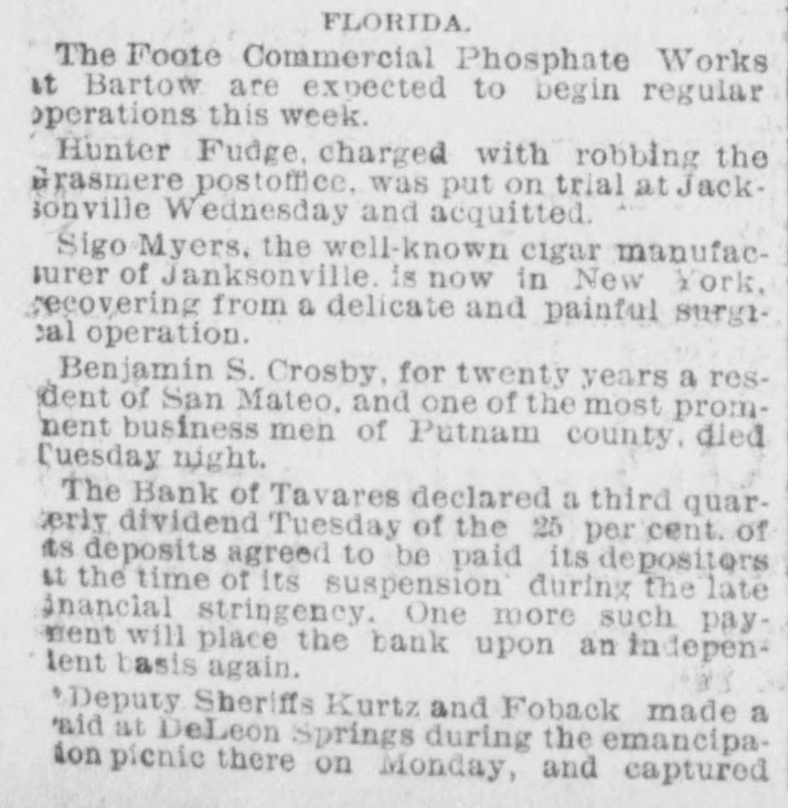 FLORIDA. The Foote Commercial Phosphate Works it Bartow are expected to begin regular operations this week. Hunter Fudge, charged with robbing the Grasmere postoffice, was put on trial at Jacksonville Wednesday and acquitted. Sigo Myers. the well-known cigar manufacsurer of Janksonville. is now in New York, recovering from a delicate and painful surgical operation. Benjamin S. Crosby, for twenty years a resdent of San Mateo. and one of the most promnent business men of Putnam county. died Tuesday night. The Bank of Tavares declared a third quarerly dividend Tuesday of the 25 per cent. of as deposits agreed to be paid its depositors st the time of its suspension during the late inancial stringency. One more such payment will place the bank upon an indepenlent basis again. Deputy Sheriffs Kurtz and Foback made a 'aid at DeLeon Springs during the emancipaion pienic there on Monday, and captured