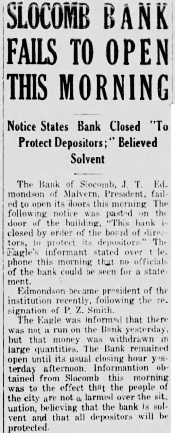 SLOCOMB FAILS TO THIS MORNING Notice States Bank Closed Protect Depositors;" Believed Solvent The Bank of Slocomb, mondson doors this morning notice the door building. bank closed by order the of protect Engle's informant stated phone this morning that officials of the bank could be for state Edmondson president of institution following the signation The Eagle informed that there not run the Bank that money withdrawn large quantities. The Bank remained until its usual closing hour open terday Informantion tained from Slocomb this morning was to the effect that the people the city larmed the believing that the bank uation, that all depositors will vent protected