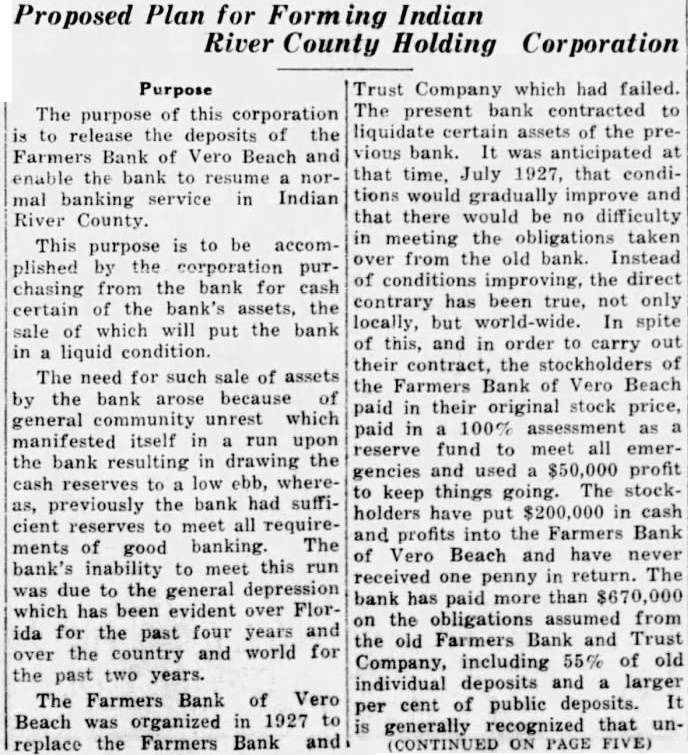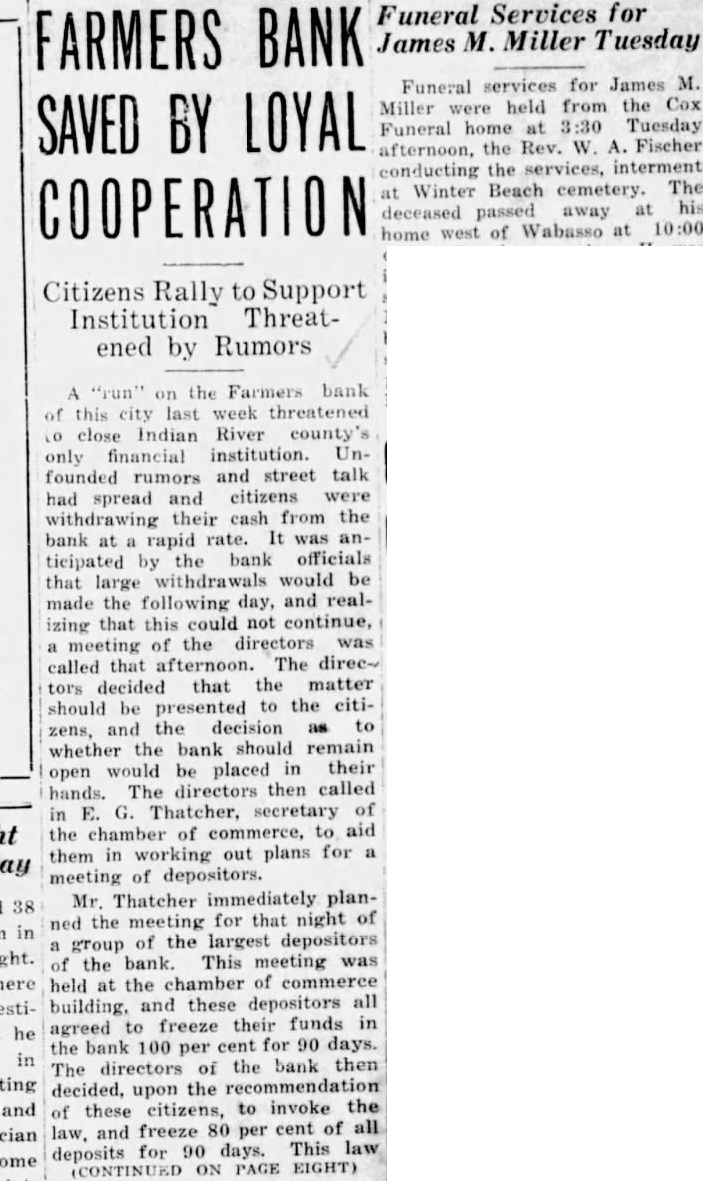 Funeral Services FARMERS BANK James Tuesday Funeral services for James held from the Cox Miller SAVED BY LOYAL Funeral home at Tuesday the Rev. Fischer the services, interment conducting The Winter Beach cemetery. at his deceased passed away west of Wabasso at home Citizens Rally to Support Institution Threatened by Rumors "run" the Farmers this city last week threatened close Indian River county's financial institution. Unonly founded and street talk rumors spread and citizens were withdrawing their cash from the bank at rapid rate. the bank officials ticipated by that large withdrawals would be made the following day, and realizing that this could not continue, meeting of the directors was called that afternoon. The direcdecided that the matter tors be to the citishould and the decision to zens, whether the bank should remain would be placed in their open The directors then called hands. Thatcher, secretary of in the chamber of commerce, to aid out plans for them in meeting of depositors. Mr. Thatcher immediately planfor that night of ned the meeting of the largest depositors group of the bank. This meeting was the chamber of commerce held at building, and these depositors all their funds in agreed to freeze the bank 100 per cent for 90 days. the bank then The directors of decided, upon the recommendation to invoke the of these citizens, law. and freeze 80 per cent of all 90 days. This law deposits for (CONTINUED ON PAGE EIGHT)