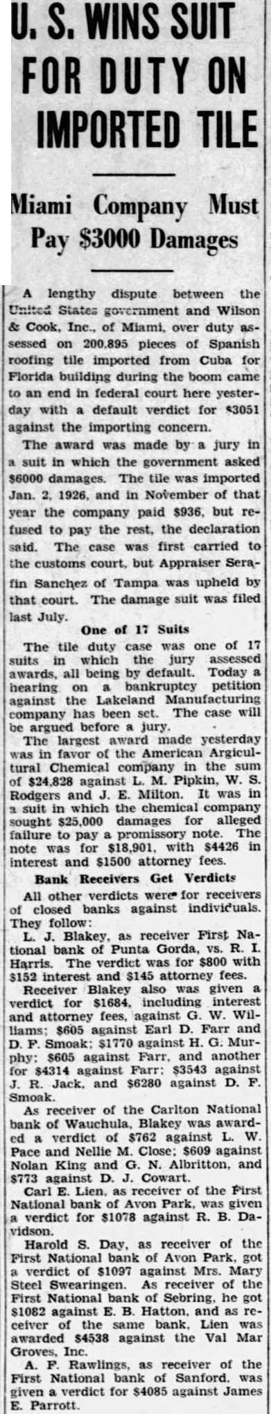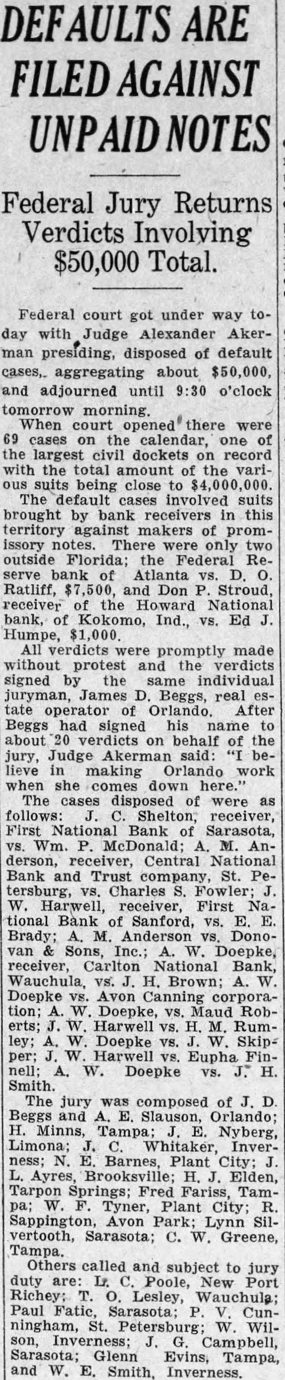 Federal court got under way today with Judge Alexander Akerman presiding, disposed of default cases, aggregating about $50,000, and adjourned until 9:30 o'clock tomorrow morning. When opened there were 69 cases on the calendar, one the largest civil dockets on record with the total amount of the various suits being close cases involved suits brought by bank receivers in this territory of issory There two outside Florida; the Federal Reserve bank Atlanta D. Ratliff, $7,500, and Don P. Stroud, receiver of the Howard bank, Ind., VS. Ed Humpe, verdicts were promptly made without protest and the verdicts signed by the same individual juryman, James D. Beggs, real tate operator of Orlando. After Beggs had signed his name about 20 verdicts on behalf the jury, Judge said: making Orlando work when she comes here.' The cases disposed of were as follows: Shelton, receiver, First National Bank of Sarasota, VS. Wm. P. McDonald; M. Anderson, Central Bank and St. PeVS. Charles W. receiver, First Na. tional Bank Sanford, VS. E. E Brady; Anderson VS. Donovan Sons, Inc.; W. Doepke, receiver, Carlton National Bank, Wauchula, H. Brown; A. Doepke tion; Doepke, vs. Roberts; Harwell vs. M. Rumley; Doepke vs. Skipper; W. Harwell Eupha Finnell; A. W. Doepke vs. H. Smith. The jury was composed of Beggs and Slauson, Orlando; Minns, Tampa E. Nyberg, Limona; Whitaker Inverness; N. E. Barnes, Plant City: Ayres, Brooksville; H. Elden, Tarpon Springs; Fred Fariss, Tampa; Tyner, Plant City R Sappington, Avon Park Lynn Silvertooth, Sarasota; C. W. Greene, Tampa. Others called subject to jury duty are: Lr. Poole, New Port Richey: O. Lesley, Wauchula Paul Fatic, Sarasota: Cunningham, St. Petersburg: W. Wilson, Inverness; Campbell, Glenn Evins, Tampa, and W. E. Smith, Inverness.