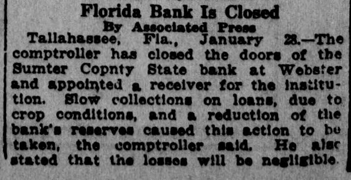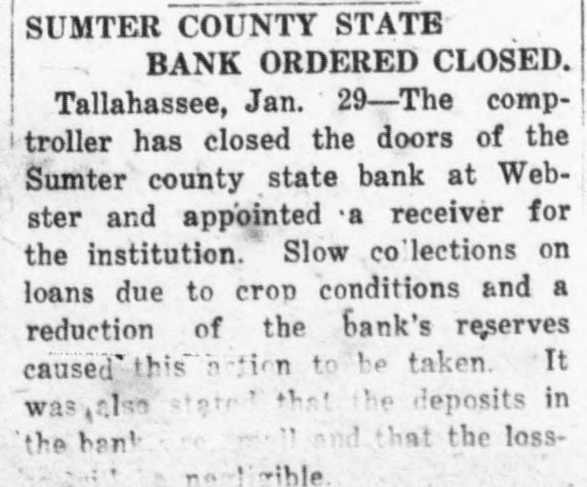 SUMTER COUNTY STATE BANK ORDERED CLOSED. Tallahassee, Jan. 29-The comptroller has closed the doors of the Sumter county state bank at Webster and appointed a receiver for the institution. Slow collections on loans due to crop conditions and a reduction of the bank's reserves caused this action to be taken. It was stated that the deposits in that the lossthe bani natirible