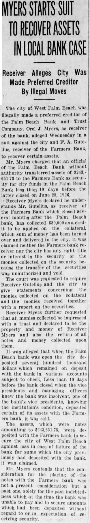 MYERS STARTS SUIT TO RECOVER ASSETS IN LOCAL BANK Receiver City Was Alleges Made Preferred Creditor By Illegal Moves The city of West Palm Beach was illegally made preferred creditor of the Palm Beach Bank and Trust Company, Orel Myers, as receiver of the bank, alleged Wednesday in suit against the city and F. A. Gutelius, receiver of the Farmers Bank, to recover certain Mr. Myers charged that an official the Palm Beach Bank without authority transferred of $243,the Farmers Bank as securIty city funds the Palm Beach Bank less than 10 days before the latter closed June 1926. Receiver Myers he understands Mr. Gutelius, receiver the Farmers Bank which closed several months after the Palm Beach bank, has collected $80,000 be applied the collateral, which money has been turned and delivered to the city. was claimed neither the Farmers bank celver nor the has any right, title interest the security the monies the security because the transfer of the securities was and The court was requested to require Receiver Gutelius and the city statements concerning the monies collected on the collateral and the monies received together report on the securities. Receiver Myers further requested that all monies collected be impressed with trust and declared to be the property money Receiver Myers also return of all notes and money collected upon them. It was alleged that when the Palm Beach bank was open the city posited several hundred thousand dollars which remained on deposit with the bank various accounts subject check. Less than 10 days before the bank closed when the vice presidents and managing officers knew the was insolvent, one the bank's vice presidents, knowing the institution's deposited certain of its assets with the Farmers bank, was said. The which were notes amounting to were deposited with the Farmers bank secure the city of West Palm Beach against in case of failure of the bank for sums which the city previously had deposited with the bank, was Mr. Myers that the confor the placing of the notes with the Farmers was not present but past one, solely for the past indebtedness which the time the bank was unable pay and secure amounts which had been deposited without regard to expectation of receiving security.