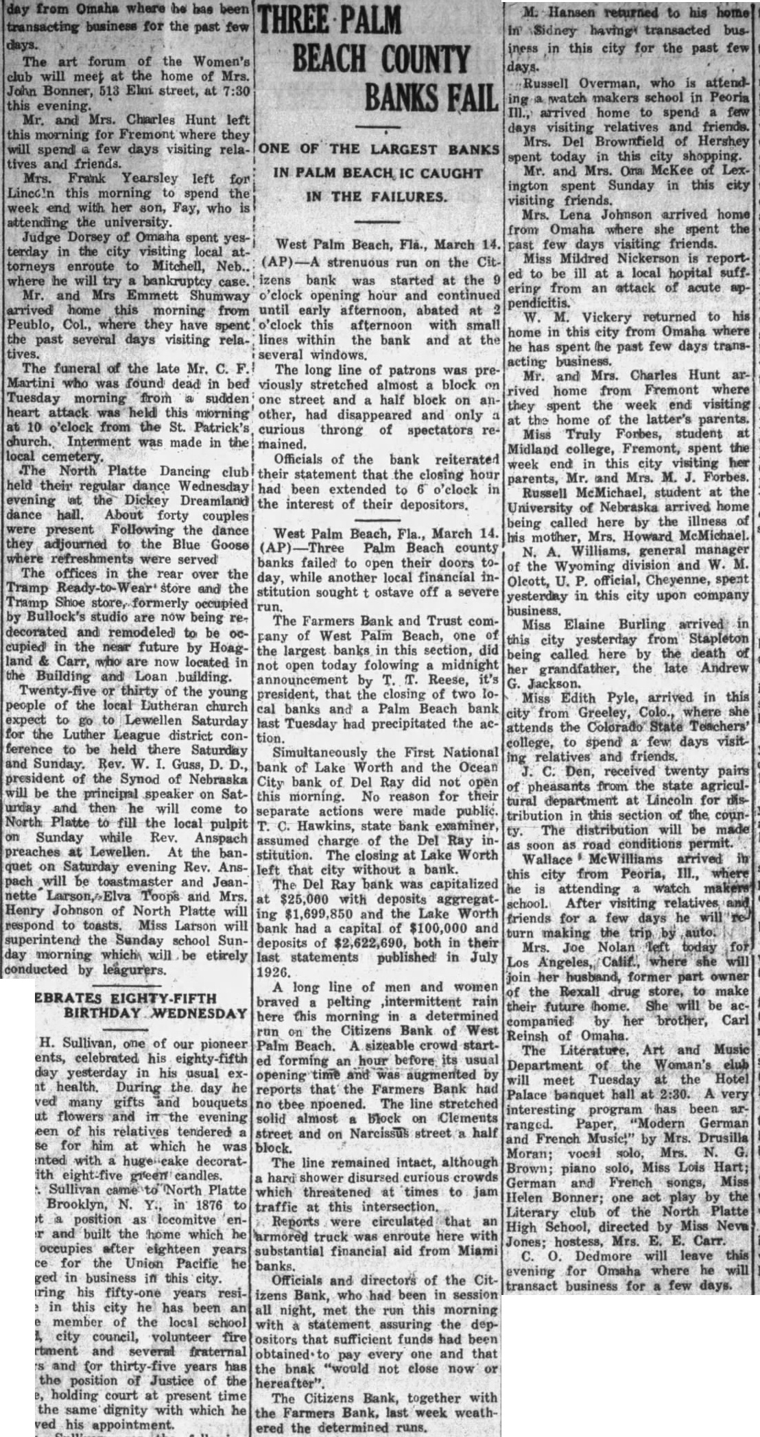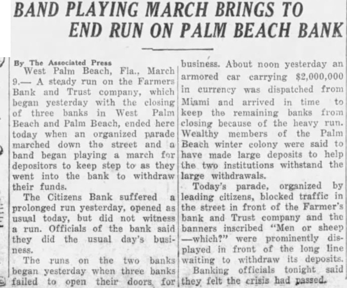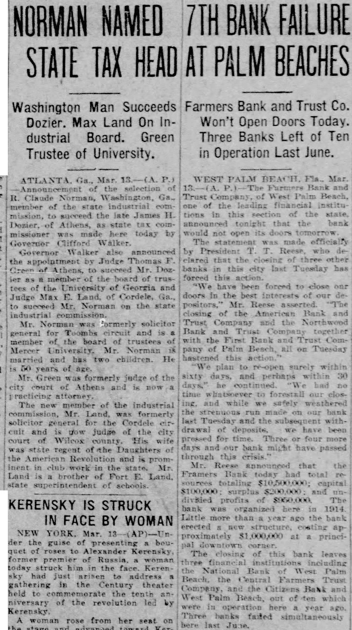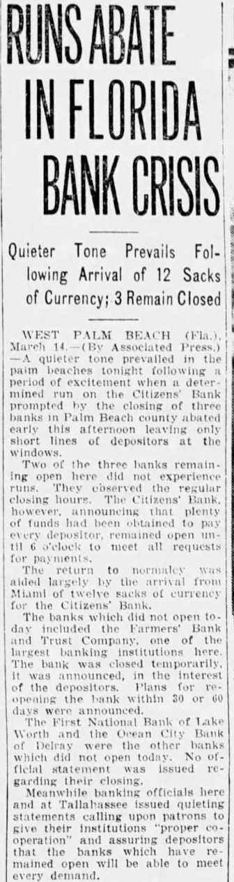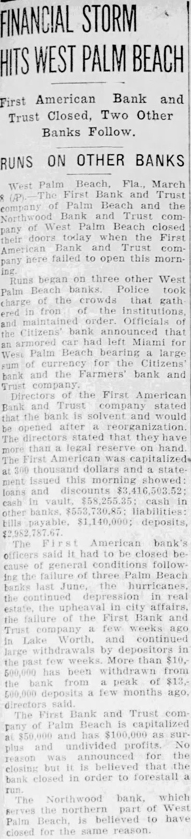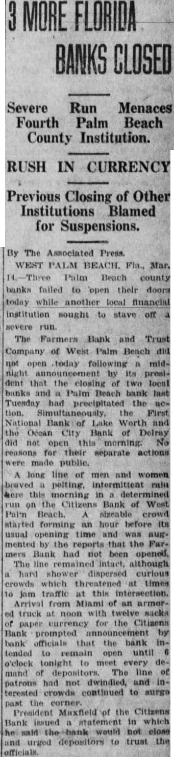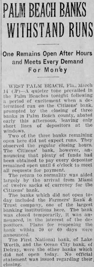 West Palm Beach, March 14. Palm Beach banks failed to open their doors while another local financial stitution sought ostave off