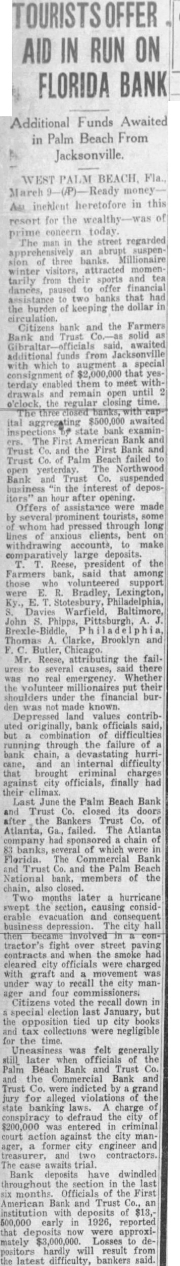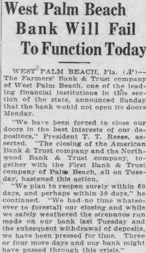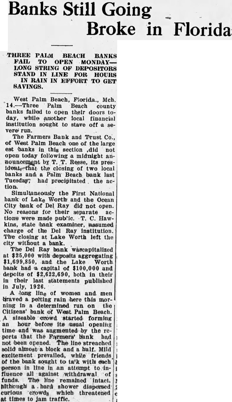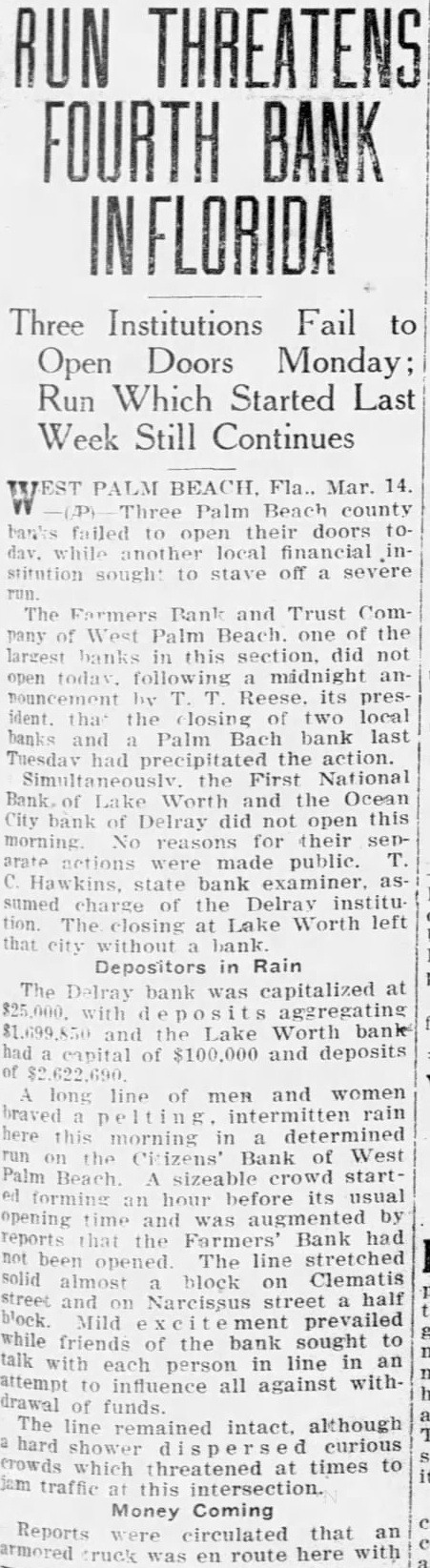 Farmers Bank and Trust company of West Palm Beach, one of largest banks in this section, did open today folowing midnight by Reese, president, that the closing of banks and Palm Beach bank last Tuesday had precipitated the the First National of Lake Worth and the Ocean bank of Del Ray did not open morning. No reason for their separate actions were made public. Hawkins, state bank examiner, assumed charge of the Del Ray stitution. The closing at Lake that city without bank. Del Ray bank was capitalized deposits aggregatand the Lake Worth had capital of and $2,622,690, both in their last statements published in July long line of men and women braved pelting rain here this morning determined the Citizens Bank of Palm Beach. sizeable crowd startforming hour before its usual opening and was augmented by reports that the Farmers Bank had The line stretched solid almost block on Clements street and Narcissus street block. The line remained intact, although shower crowds which threatened at times to at this intersection. Reports were circulated that armored truck enroute here with substantial financial aid from Miami banks. Officials and directors of the Citizens Bank, who had been session all night, met the run this morning statement assuring the depositors that sufficient funds had been every one and that pay the bnak "would not close or The Citizens Bank, together with the Farmers Bank, last week weathered the determined runs.