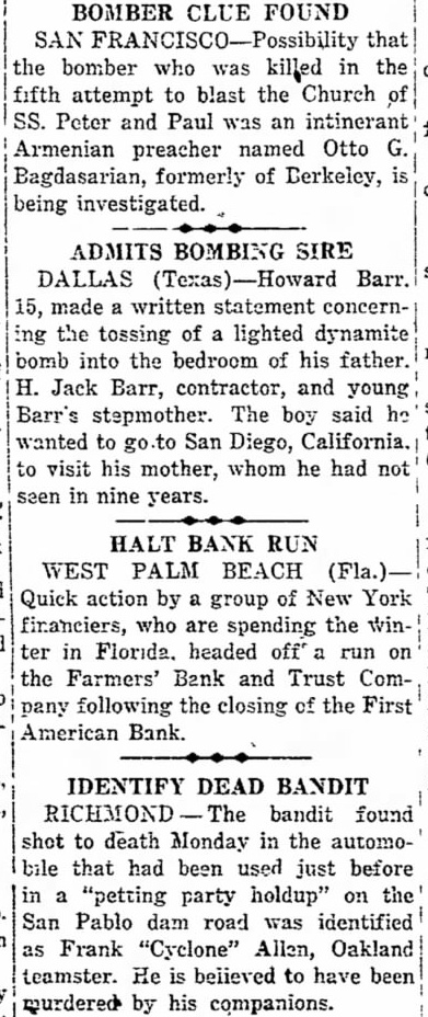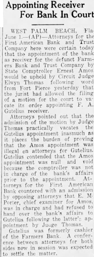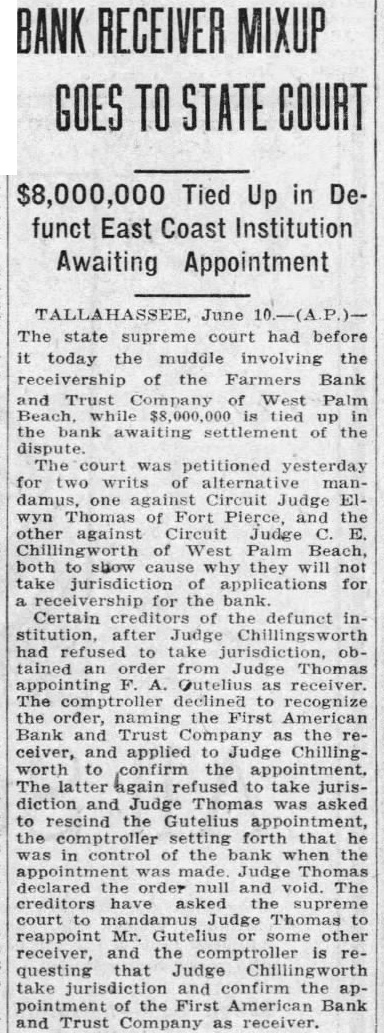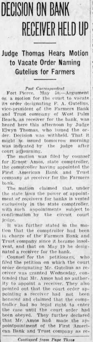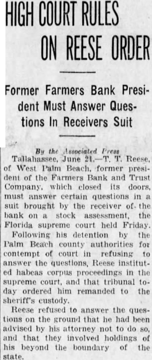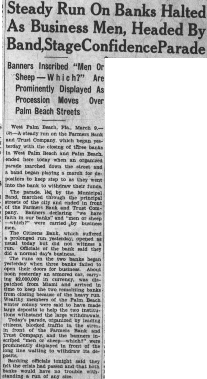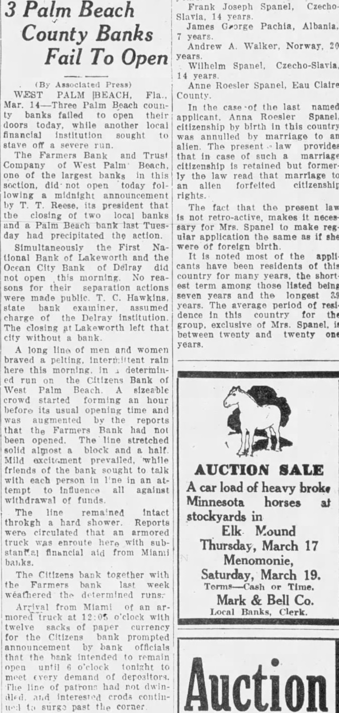 Farmers Bank and Trust company of West Palm Beach, one of largest banks in this section, did open today folowing midnight by Reese, president, that the closing of banks and Palm Beach bank last Tuesday had precipitated the the First National of Lake Worth and the Ocean bank of Del Ray did not open morning. No reason for their separate actions were made public. Hawkins, state bank examiner, assumed charge of the Del Ray stitution. The closing at Lake that city without bank. Del Ray bank was capitalized deposits aggregatand the Lake Worth had capital of and $2,622,690, both in their last statements published in July long line of men and women braved pelting rain here this morning determined the Citizens Bank of Palm Beach. sizeable crowd startforming hour before its usual opening and was augmented by reports that the Farmers Bank had The line stretched solid almost block on Clements street and Narcissus street block. The line remained intact, although shower crowds which threatened at times to at this intersection. Reports were circulated that armored truck enroute here with substantial financial aid from Miami banks. Officials and directors of the Citizens Bank, who had been session all night, met the run this morning statement assuring the depositors that sufficient funds had been every one and that pay the bnak "would not close or The Citizens Bank, together with the Farmers Bank, last week weathered the determined runs.