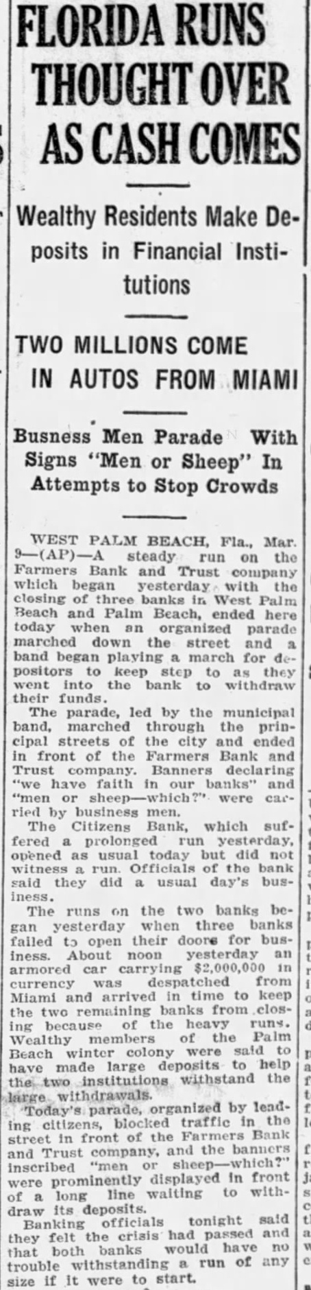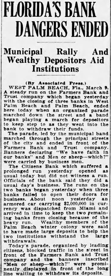 WEST PALM BEACH, Fla., Mar run the Farmers Bank and Trust which began yesterday with the closing three banks West Palm Beach and Palm Beach, ended here today when organized parade marched down the street and band began playing march for positors keep step to they went into the to withdraw their funds. parade, led the municipal band, marched through the principal streets of the city ended in front the Farmers Bank and Trust Banners "we faith in banks" and "men ried by business men. Citizens Bank, which suffered prolonged opened usual but did not the said they did usual day's business. The runs on the two banks beyesterday when three banks failed open their doors for business. About noon yesterday an armored car carrying $2,000,000 currency was despatched from Miami and time to keep of closthe ing Palm Beach colony were said made large deposits to help have withstand the the withdrawals. Today's parade, organized by lead. blocked traffic the ing citizens, street in front of and the banners Trust inscribed were displayed in front line waiting to withlong draw its deposits. tonight said Banking officials crisis had passed felt the banks would have that both withstanding run of any trouble if it were to start. size