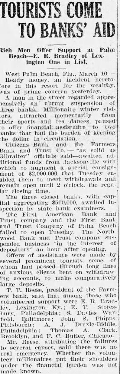 West Palm Beach, March Ready money. incident heretofore this resort for the wealthy. of prime concern in the street regarded apprehensively an abrupt suspension three banks. Millionaire winter visitors, attracted momentarily from their and dances, paused offer financial assistance banks that had the burden of keeping the dollar circulation. Citizens Bank and the Farmers Bank and Trust Gibralter" officials additional funds from which augment consignment $2,000,000 that Tuesday abled them meet withdrawals and remain until o'clock, the regular closing time. The three closed banks, with eapital awaited in by state bank examiners. The First Bank and Trust and the First Bank and Trust Company of Palm Beach failed open Tuesday The Northwood Bank and Trust pended the interest hour after opening. Offers of made several prominent whom had passed through long lines of anxious clients bent withdraw ing accounts, make deposits. Reese. president of the Farmbank. that among who support were John Philadelphia Clark, and Butler. Chicago. Mr. the failures to said there emergency. Whether the volunteer millionaires put their under the financial burden was not made known.