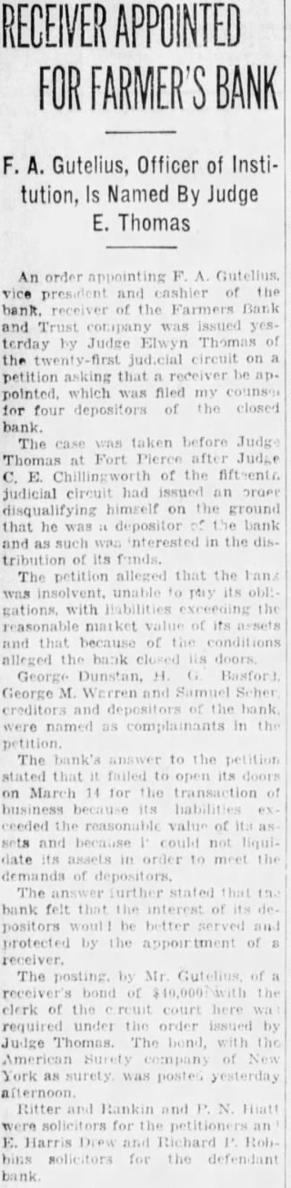 An order appointing F. A. Gutelius. vice president and cashier of the bank. receiver of the Farmers Bank and Trust issued terday by Judge Elwyn Thomas the on petition asking that pointed. which filed my for four depositors of the closed bank. The before Judg Thomas Fort Judge E. of the judicial had order disqualifying himself on the ground that he was bank and interested in the dis its funds. The petition alleged that the was unable the market its and that because of the alleged the doors George George M and Samuel named as complainants in the The to the its on March the its ceeded of sets and date its order to meet the demands of The that bank felt that the positors be better and protected by the appoir of The posting. by Mr Gutelius of bond of $10,000 clerk of the court here required under the order issued by Judge Thomas. The bond, with the American York as was posted yesterday the Harris and Richard Rob bins for the defendant bank