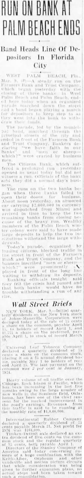 WEST PALM run Bank Company began the West Palm end the street band keep to the bank to The by the through the the the Farmers Bank and Trust claring have faith and by business The Citizens which fered yesterday opened as but not of the bank they a normal The runs on the two banks when three tanks failed to open their doors About noon yesterday armored in currency dispatched from Miami and was time to the two remaining banks from closing be of the heavy run. Wealthy of the Palm Beach ter were said to have made deposits to help the two withstand the large with stitutions organized by Today leading traffic in in front of the Farmers street and Trust and Bank banners men sheep which played in front of the long waiting withdraw deposits. Bank officials tonight said felt crisis had passed and that both banks would have withstanding a run of