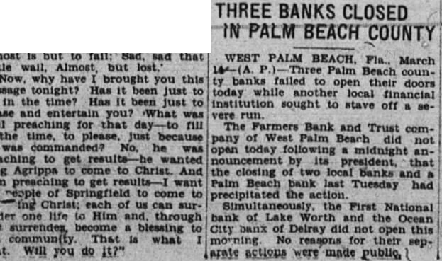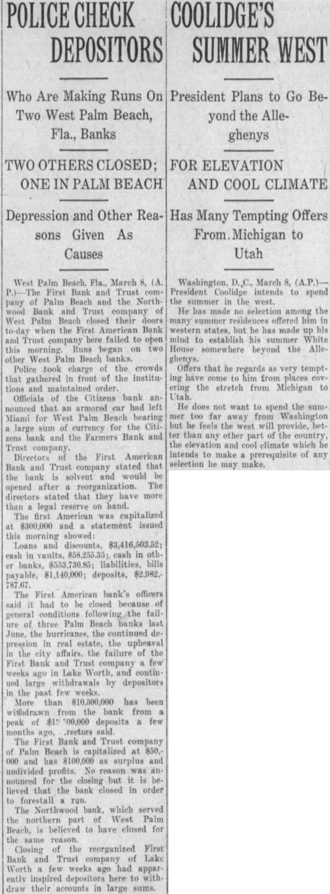 West Palm Beach, Fla., March First Bank and Trust Palm Beach and the Northpany Bank and Trust West Palm closed their the First Bank Trust here failed to this on other West Palm Beach banks. Police the crowds charge that gathered in front the instituOfficials the Citizens bank nounced armored car Miami for Palm bearing the large currency bank and the Farmers Bank and Trust Directors the First American and Trust company stated that the bank solvent would opened The stated more legal reserve first American was capitalized $300,000 issued showed: discounts, $3,416,503.52; in bills deposits, The First bank's officers said had closed general three Beach banks last June, the estate, the upheaval the city the failure of the First Bank and Trust company few weeks Lake Worth, contin large withdrawals by depositors the More $10,500,000 has been bank from deposits few months rectors The First Bank and Trust company Palm Beach $50. as surplus and undivided nounced for the closing but lieved that the bank closed in order The bank, which served the part West Palm Beach, believed to closed for the Closing the reorganized First Bank and Trust company Lake Worth weeks ago had appar draw accounts in large sums.
