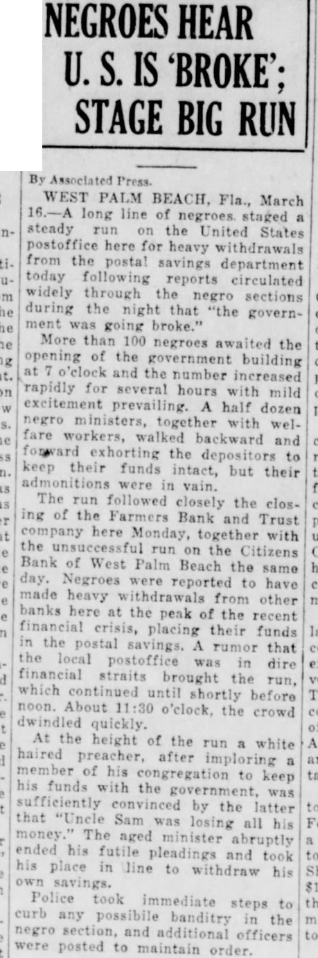 By Associated WEST PALM BEACH, Fla., March long line of staged steady on the United States postoffice here for withdrawals from the postal savings department today following reports circulated widely through the negro sections during the that "the governgoing broke." More than 100 negroes awaited the opening of the government building and the number increased rapidly for several hours with mild prevailing. half dozen negro with backward and forward their funds intact, but their vain. The run followed closely the closing of the Farmers Bank and Trust here Monday, together with the run the Citizens Bank of West Palm Beach the same day. Negroes reported to have made heavy withdrawals from other banks here at the peak of the recent placing their funds the postal savings. rumor that postoffice dire financial straits brought the run, which continued until shortly before noon. About o'clock, the crowd dwindled quickly. At height of the run white haired preacher, after of his congregation to keep his funds with the sufficiently convinced by the latter that "Uncle Sam losing all his money. The aged minister abruptly ended his futile pleadings and took his place line to withdraw his savings. Police steps curb possibile banditry the negro section, and officers posted to maintain order.