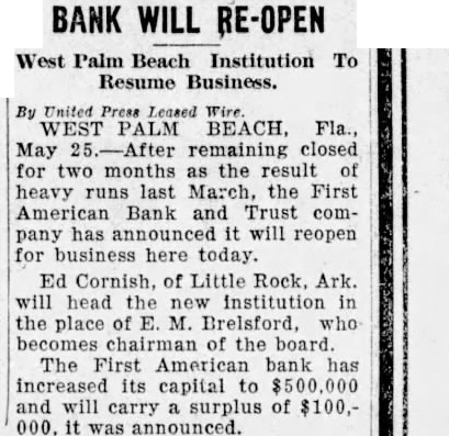 WEST PALM BEACH, Three leading banks of the Palm Beaches closed their doors this morning and started one of the most frenzied runs in the history of Florida finance. Mid-day found streets jammed with deseeking to save their positors money by from remaining banks of the Runs on the Bank and the Citizens Bank West Palm Beach each were such that an armored car was dispatched from Miami bearing cash for panicky depositors. No sooner had the First American Bank and Trust Company posted notice that business was suspended for the protection of depositors than two other institutions Bank and Trust Company of West Palm Beach and the Bank and Trust Company of Palm Beach. Heavy withdrawals on all three banks during past eight or ten months and unsettled condition of affairs in this part of the state were given as reasons for the closings. Long queues of worried depositors wited during the early afternoon to withdraw their savings from banks remaining open. Police kept the lines moving. As result of the closing of the First Bank and Trust Company, Palm Beach was left today without chartered bank. E. M. Brelsford, Palm Beach, capitalist and south Florida pioneer, was president of the First American Bank, which was the first to announce it had closed. Brelsford was also an officer of the First Bank and Trust Company.