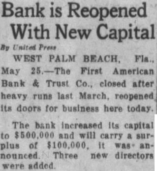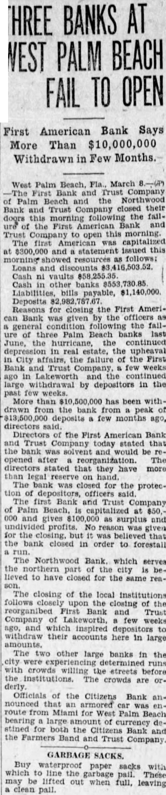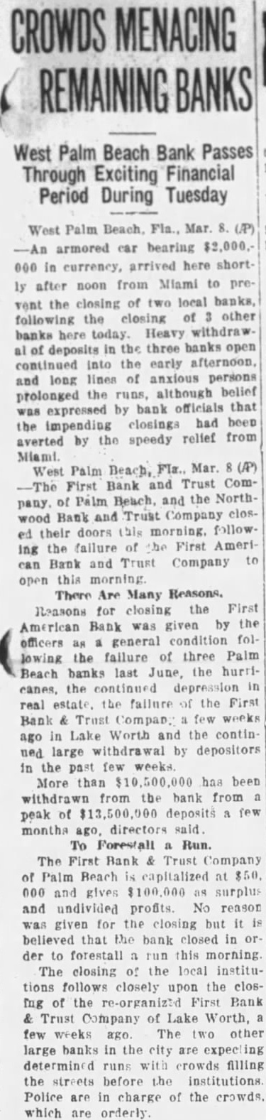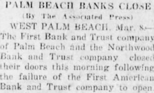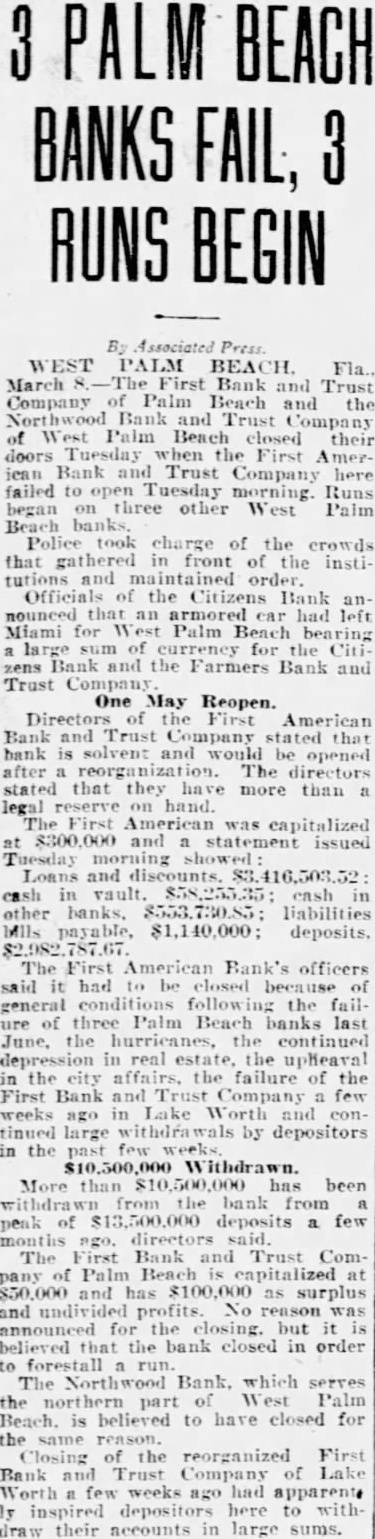 WEST PALM BEACH, March First Bank and Trust Company Palm Beach and the Northwood Bank and Trust Company of West Palm Beach clostheir doors today when the First American Bank and Trust Company here failed this morning. open Runs began two other Palm Beach banks. Police took charge of the crowds that gathered in front of the instituand maintained order. Directors of First American Bank and Trust Company stated that bank would opened after The directors stated that they have than legal reserve on hand. The First American Bank's said had to closed general conditions following failure of three Palm Beach banks last June, the hurricanes, the continued in real estate, the upheaval the city affairs, failure of the First Bank and Trust Company weeks ago in Lake Worth continued withdrawby depositors in the past weeks. It capitalized at First Bank and Trust pany of Beach capitalized $50,000. No reason was announced the closing but is believed that the bank closed in order to forestall The Northwood Bank, which the northeastern part of West Palm Beach, believed to have closed the same reason.
