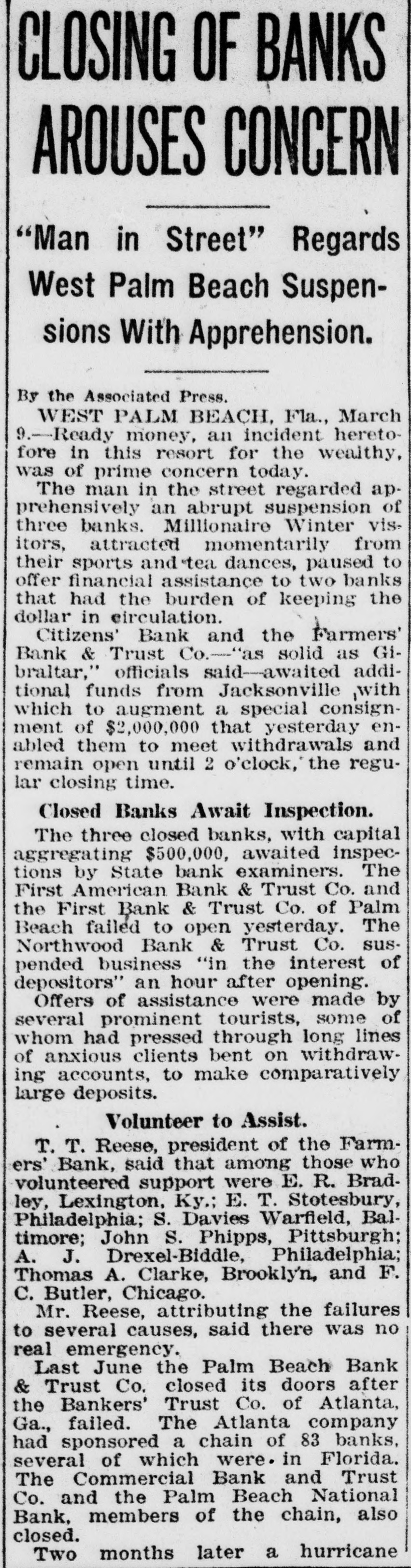 CLOSING OF BANKS AROUSES CONCERN "Man in Street" Regards West Palm Beach Suspensions With Apprehension. By the Associated Press. WEST PALM BEACH, Fla., March 9.-Ready money, an incident heretofore in this resort for the wealthy, was of prime concern today. The man in the street regarded apprehensively an abrupt suspension of three banks. Millionaire Winter visitors, attracted momentarily from their sports and tea dances, paused to offer financial assistance to two banks that had the burden of keeping the dollar in circulation. Citizens' Bank and the Farmers' Bank & Trust Co.-"as solid as Gibraltar," officials said-awaited additional funds from Jacksonville ,with which to augment a special consignment of $2,000,000 that yesterday enabled them to meet withdrawals and remain open until 2 o'clock, the regular closing time. Closed Banks Await Inspection. The three closed banks, with capital aggregating $500,000, awaited inspections by State bank examiners. The First American Bank & Trust Co. and the First Bank & Trust Co. of Palm Beach failed to open yesterday. The Northwood Bank & Trust Co. suspended business "in the interest of depositors" an hour after opening. Offers of assistance were made by several prominent tourists, some of whom had pressed through long lines of anxious clients bent on withdrawing accounts, to make comparatively large deposits. Volunteer to Assist. T. T. Reese, president of the Farmers' Bank, said that among those who were ley, volunteered Lexington, support Ky.; E. T. E. Stotesbury, R. BradPhiladelphia; S. Davies Warfield, Baltimore; John S. Phipps, Pittsburgh; A. J. Drexel-Biddle, Philadelphia; Thomas A. Clarke, Brooklyn, and F. C. Butler, Chicago. Mr. Reese, attributing the failures to several causes, said there was no real emergency. Last June the Palm Beach Bank & Trust Co. closed its doors after the Bankers' Trust Co. of Atlanta, Ga., failed. The Atlanta company had sponsored a chain of 83 banks, several of which were. in Florida. The Commercial Bank and Trust Co. and the Palm Beach National Bank, members of the chain, also closed. Two months later a hurricane
