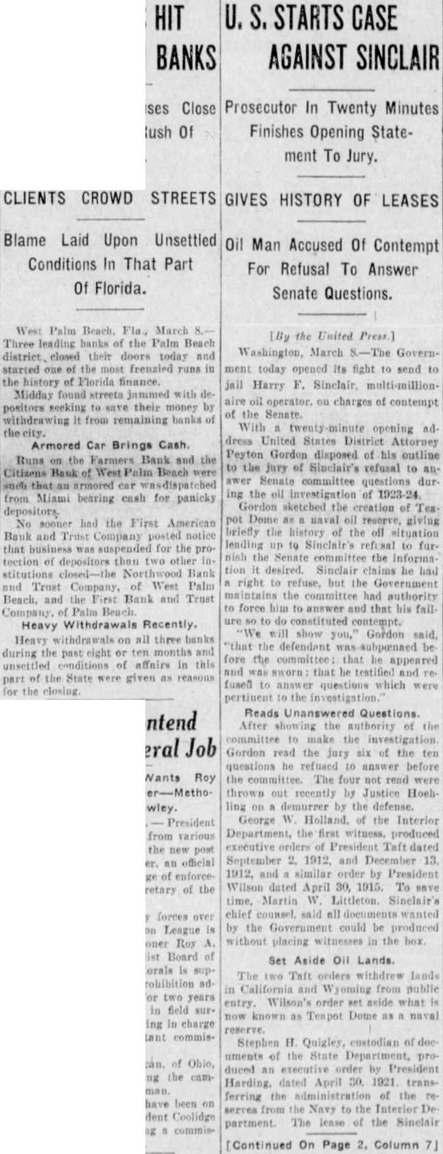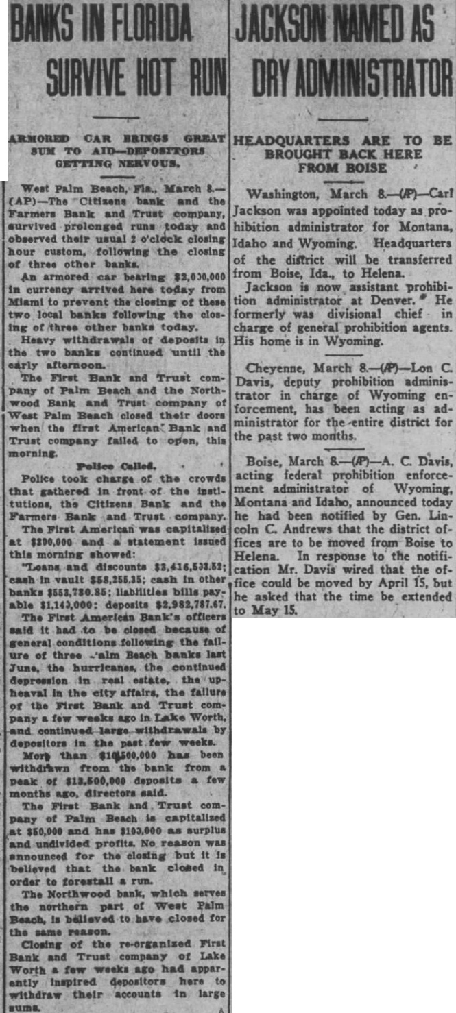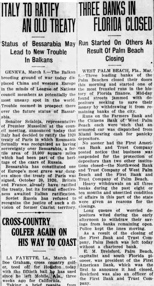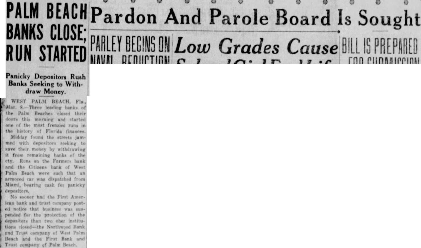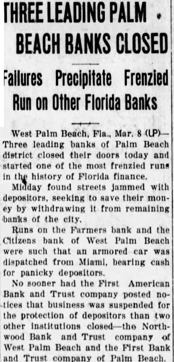 West Palm Beach, Fla., Mar. Three leading banks of Palm Beach district closed their doors today and started one of the most frenzied runs in the history of Florida finance. Midday found streets jammed with depositors, seeking to save their money by withdrawing from remaining banks of the city. Runs on the Farmers bank and the Citizens bank of West Palm Beach were such that an armored car was dispatched from Miami, bearing cash for panicky depositors No sooner had the First American Bank and Trust company posted notices that business was suspended for the protection of depositors than two other institutions closed-the Northwood Bank and Trust company of West Palm Beach and the First Bank and Trust company of Palm Beach.