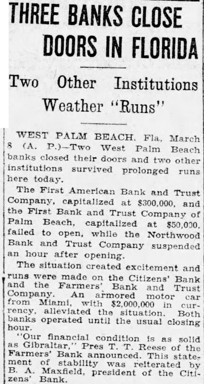 WEST PALM BEACH. Fla, March 8 (A. P.)-Two West Palm Beach banks closed their doors and two other institutions survived prolonged runs here today. The First American Bank and Trust Company, capitalized at $300,000. and the First Bank and Trust Company of Palm Beach, capitalized at $50,000 failed to open, while the Northwood Bank and Trust Company suspended an hour after opening. The situation created excitement and runs were made on the Citizens' Bank and the Farmers' Bank and Trust Company. An armored motor car from Miami, with $2,000,000 in currency, alleviated situation Both banks hour. operated until the usual closing 'Our financial condition is as solid as Gibraltar, Pres T.T. Reese of the Farmers' Bank This statement of stability was reiterated B. Maxfield, president of the Citizens' Bank.