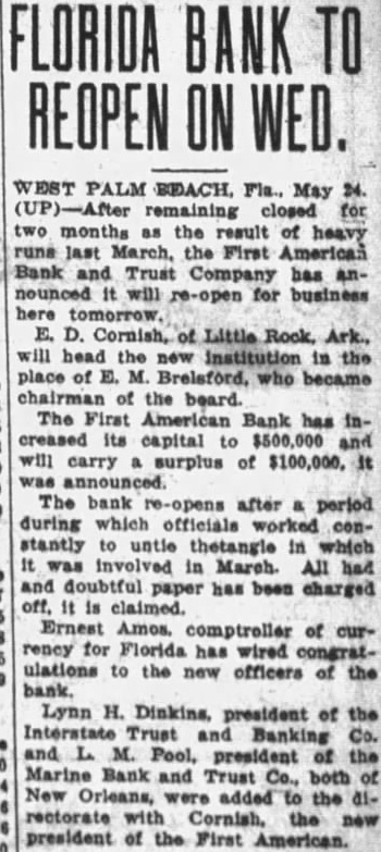 WEST PALM May remaining closed for two months the result of heavy last the First American Bank and Trust Company has announced will for business Cornish, will head the new institution in place of Brelsford, became chairman the beard The First American Bank has creased its capital $500,000 will carry surplus of $100,000. announced. The bank after period during which officials worked stantly untie thetangle in which involved in March. All and doubtful paper has been charged off. claimed. Ernest Amos. comptroller of rency for Florida has wired ulations the new officers the bank. Lynn H. Dinkins. president of the Trust and Banking and M. president Marine Bank and Trust both New Orleans, were added to the rectorate the new president of the First American.