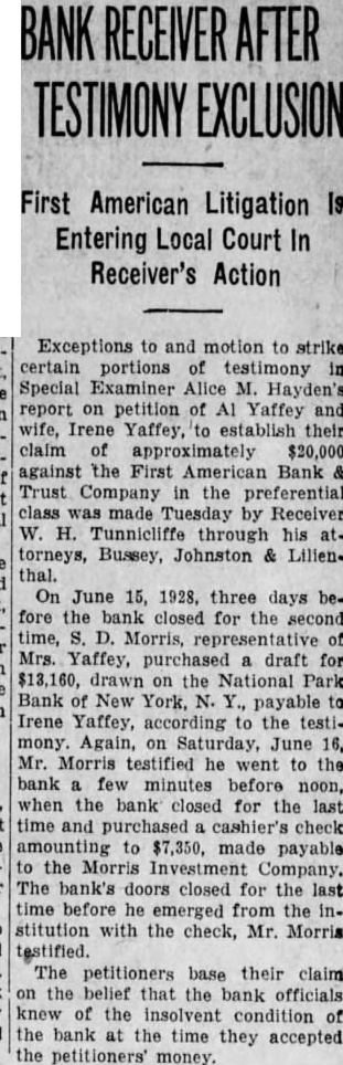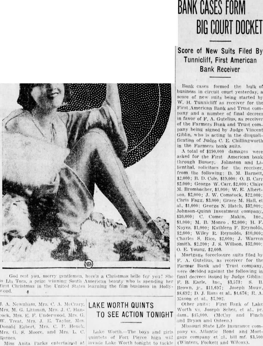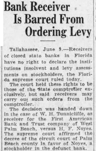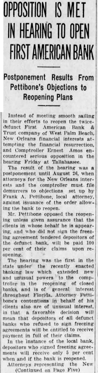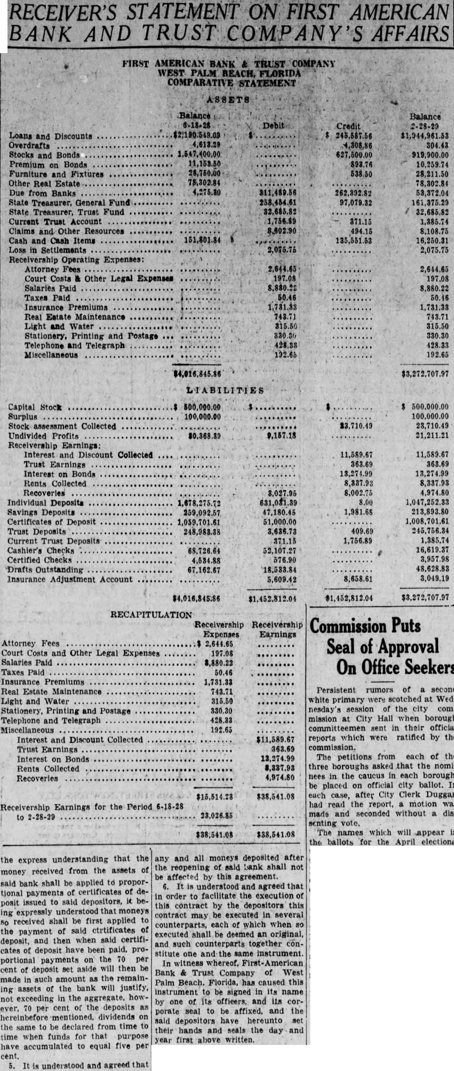 FIRST AMERICAN BANK & TRUST COMPANY WEST PALM BEACH, FLORIDA COMPARATIVE STATEMENT ASSETS Balance Balance Debit Credit 2-28-29 Loans and Discounts $2,190,549.09 245,587.56 Overdrafts 4,613.29 4,308.86 304.43 Stocks and Bonds 1,547,400.00 627,500.00 919,900.00 Premium on Bonds 893.76 10,259.74 Furniture and Fixtures 28,750.00 538.50 28,211.50 Other Real Estate 78,302.84 78,302.84 Due from Banks 311,489.56 262,392.82 53,372.04 State Treasurer, General Fund 97,079.32 State Treasurer, Trust Fund 32,685.82 32,685.82 Current Trust Account 1,736.89 371.15 1,385.74 Claims and Other Resources *********** 494.15 8,108.75 Cash and Cash Items 151,801.84 135,551.53 16,250.31 Loss in Settlements 2,075.75 Receivership Operating Expenses: Attorney Fees 2,644.65 2,644.65 Court Costs & Other Legal Expenses 197.08 197.08 Salaries Paid 8,880.22 8,880.22 Taxes Paid 50.46 50.16 Insurance Premiums 1,731.33 Real Estate Maintenance 743.71 Light and Water 315.50 315.50 Stationery, Printing and Postage 330.30 330.30 Telephone and Telegraph 428.33 428.33 Miscellaneous 192.65 $4,016,845.86 $3,272,707.97 LIABILITIES Capital Stock 500,000.00 $ $ 500,000.00 Surplus 100,000.00 Stock assessment Collected $3,710.49 23,710.49 Undivided Profits $0,368.39 21,211.21 Receivership Earnings: Interest and Discount Collected 11,589.67 11,589.67 Trust Earnings 363.69 363.69 Interest on Bonds 13,274.99 13,274.99 Rents Collected 8,837.93 8,337.93 Recoveries 8,002.75 4,974.80 Individual Deposits 1,678,275.72 8.00 1,047,252.33 Savings Deposits 259,092.57 47,180.45 213,893.80 Certificates of Deposit 1,059,701.61 51,000.00 1,008,701.61 Trust Deposits 248,988.38 3,636.73 409.69 245,756.34 Current Trust Deposits 371.15 1,756.89 1,385.74 Cashier's Checks 68,726.64 52,107.27 16,619.37 Certified Checks 576.90 3,957.98 Drafts Outstanding 67,162.67 18,533.84 48,628.83 Insurance Adjustment Account 5,609.42 8,658.61 3,049.19 $4,016,845.86 $1,452,812.04 $1,452,812.04 $3,272,707.97 RECAPITULATION Receivership Receivership Commission Puts Expenses Earnings Attorney Fees $ 2,644.65 Seal of Approval Court Costs and Other Legal Expenses 197.08 Salaries Paid 8,880.22 On Office Seekers Taxes Paid 50.46 Insurance Premiums 1,731.33 Persistent rumors of a second Real Estate Maintenance 743.71 ********* Light and Water 315.50 white primary were scotched at WedStationery Printing and Postage 330.30 nesday's session of the city com428.33 mission at City Hall when borough Telephone and Telegraph committeemen sent in their official Miscellaneous 192.65 $11,589.67 reports which were ratified by the Interest and Discount Collected Trust Earnings 363.69 The petitions from each of the Interest Bonds three boroughs asked that the nomiRents Collected 4,974.80 nees in the caucus in each borough, Recoveries be placed on official city ballot. In $15,514.23 $38,541.08 each case, after City Clerk Duggan had read the report, motion was Receivership Earnings for the Period 6-18-28 23,026.85 made and seconded without disto 2-28-29 senting vote. $38,541.08 The names which will appear in $38,541.08 the ballots for the April elections,