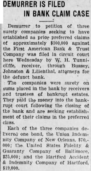 RECEIVER'S STATEMENT ON FIRST AMERICAN BANK AND TRUST COMPANY'S AFFAIRS the express understanding that the money received from the assets of said bank shall be applied to proportional payments of certificates of deposit issued to said depositors, it being expressly that so received shall be first applied to the payment of said ctrtificates of deposit, and then when said certificates of deposit have been paid. proportional payments on the 70 per cent of deposit set aside will then be made in such amount as the remaining assets of the bank will justify, not exceeding in the aggregate, however, 70 per cent of the deposits as hereinbefore mentioned. dividends on the same to be declared from time to time when funds for that purpose have accumulated to equal five per cent. 5. It understood and agreed that any and all moneys deposited after the reopening of said bank shall not be affected by this agreement. 6. It understood and agreed that in order to facilitate the execution of this contract by the depositors this contract may be executed in several counterparts, each of which when so executed shall be deemed an original, and such counterparts together constitute one and the same instrument. In witness whereof, First-American Bank & Trust Company of West Palm Beach. Florida, has caused this instrument to be signed in its name by one of its officers. and its corporate seal to be affixed, and the said depositors have hereunto set their hands and seals the day year first above written.
