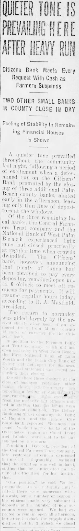 A quieter tone prevailed throughout the community night. following a period of excitement when a determined run on the Citizens' Bank. prompted by the closing of three additional Palm Beach county banks. abated early in the afternoon leaving only thin lines of depositors at the windows. Of the remaining local banks, the Central FarmTrust company and the National Bank of West Palm B light runs. but closed practically at regular time when crowds The Citizens' bank, however. announcing that plenty of funds had been obtained to pay every depositor. remained open until 6 o'clock to meet all requests for payments. It will resume regular hours today, according to B. A. Maxfield, president. The normaley was aided largely by the 12 to Bank did the Worth Bank of ted The Bank Bank of and the and to Franklin 1. president the company late expressed that the in stating no difficulties for his tion "Our but number of ble substant new counts opened. We had all but the died closed Page