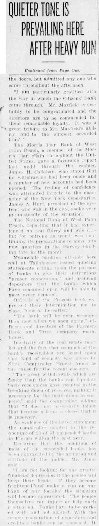 The Morris Plan Bank of West Beach, member of the MorPlan chain throughout the Uniris ted favorable report gave night through the James H. Callahan. who stated that no withdrawals had been and number of accounts had been opened. The feeling of confidence was attributed largely to the charof the New York James A. Hoyt of the who was in the spoke very of the The National Bank of West Beach reporting that it had lenced no real flurry and was car Ing for patrons was continuing new quarters in the Harvey build late the month Meanwhile banking officials and at quieting upon the patrons of banks to give their institutions "proper and assuring depositors the banks which have remained will be able to Officials of the Citizens bank pressed determination not to will than now open and of the Farmers Bank and Trust company main tained Inactivity of the real estate mar ket and the fact much of the bank receivables based upon that kind of security given by Comptroller Ernest Amos as the cause for the recent which faster than the banks can liquidate their have resulted the down of making necessary for the institutions to pend." the adding that does not follow that because bank closed that of the of banks in Florida the the condition of most of the suspended banks has the and nttitude of the public Mr. Amos am not looking for greater financial depression if people will their heads If they become frightened make run on bank of any locality the situation will become The people themselves can injure or help situation. Banks have and not With the of depositors and banks can be It