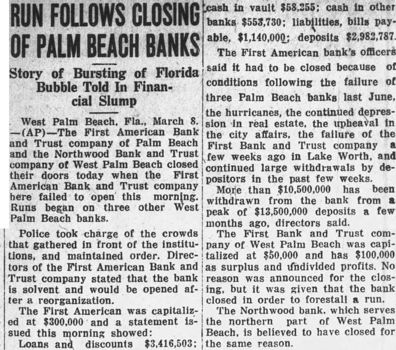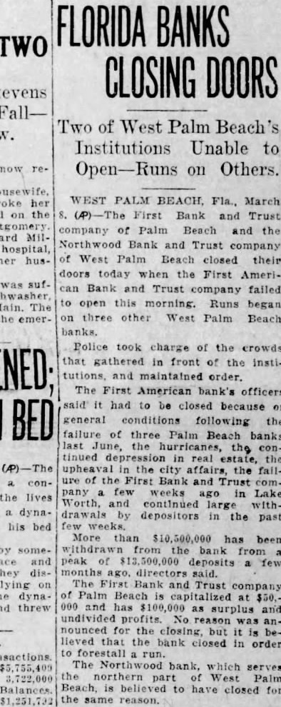 (cash in vault $58,255; cash in other banks $553,730; liabilities, bills payable, $1,140,000; deposits $2,982,787 The First American bank's officers said it had to be closed because of conditions following the failure of three Palm Beach banks last June, the hurricanes, the continued depression in real estate, the upheaval in the city affairs. the failure of the First Bank and Trust company few weeks ago in Lake Worth, and continued large withdrawals by depositors in the past few weeks. More than $10,500,000 has been withdrawn from the bank from peak of $13,500,000 deposits a few months ago, directors said. The First Bank and Trust company of West Palm Beach was capitalized at $50,000 and has $100,000 as surplus and undivided profits. No reason was announced for the closing, but it was given that the bank closed in order to forestall a run. The Northwood bank. which serves the northern part of West Palm Beach, is believed to have closed for the same reason.