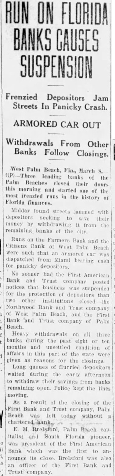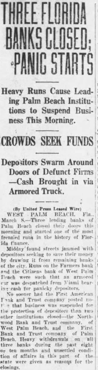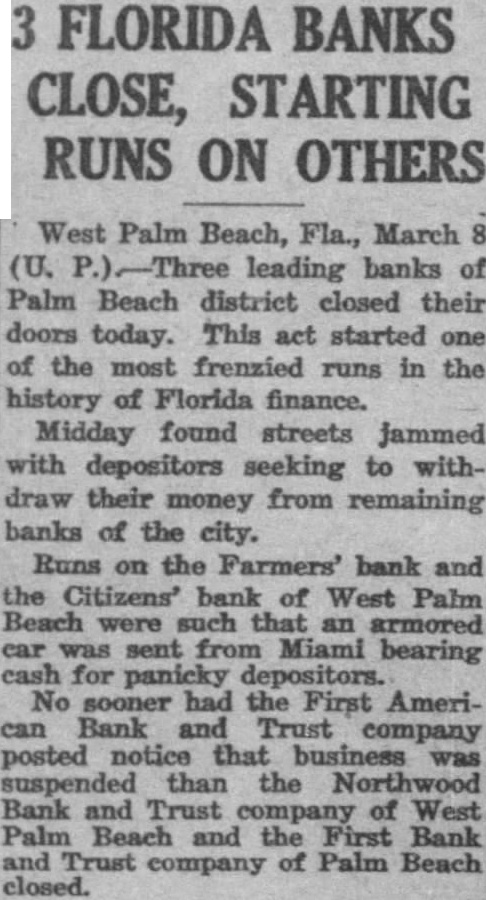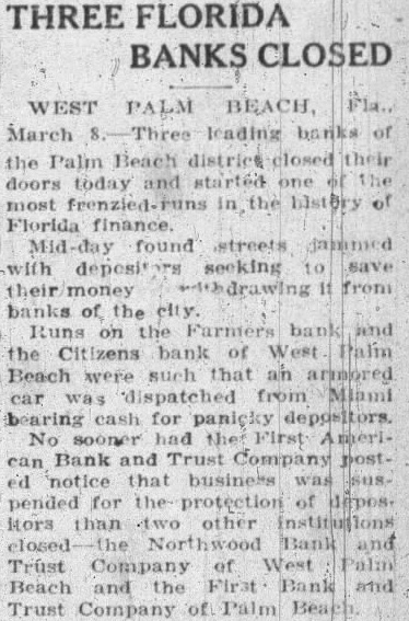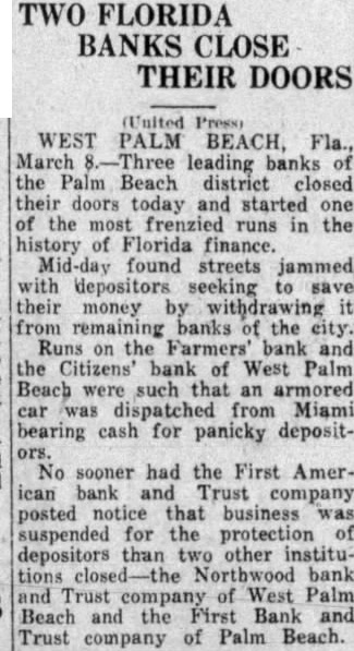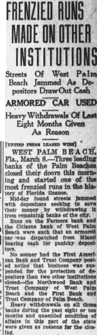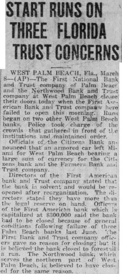 West Palm Beach, Fla., March 8. First American Bank and Trust company of Palm Beach and the Northwood Bank and Trust company of West Palm Beach closed their doors today when the First American Bank and Trust company here failed to open this morning. Runs began on three other West Palm Beach banks.