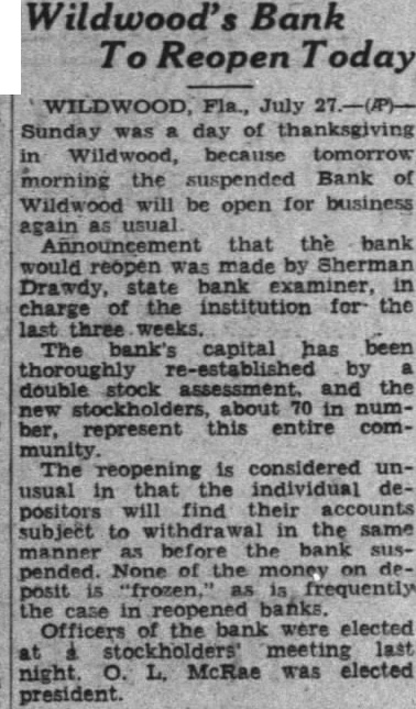 Wildwood, July day of thanksgiving in Wild wood Bank of Wildwood will suspended open for business again Announcement that the bank would was made by Sherreopen Drawdy, bank examiner, the institution for the charge last three weeks. bank's capital has been re-established double stock assessment and the stockholders, about represent this entire communreopening considered usual individual positors will find their subject the manner the bank pended. None the "frozen" frequently the reopened banks. the bank elected stockholders' meeting Saturday night. McRae electpresident. SIX JAILED FOLLOWING ATTACK ON Mobile, July men woman under here tonight charged attack Deputy Faulk Alf who were injured they sought stop disturbance hall, 14 miles Mobile today. Those arrest George Murphy, 24, Joseph Murphy, Harvey Raymond Des 40, Hutton, man Dodge and Rena The deputies are in pital here.