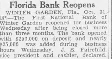 FLORIDA CALM AFTER PANIC Washington Crop Movement Report Restores Composure to Public ORLANDO, Fla, Aug. 6.-Florida's second bank panic in two years, due largely to uncertainity over marketing crops next winter because of the fruit fly quarantine, has become a thing of the past, financial interests believe. About 30 banks having closed their doors. The unexpectedness of the runs, which gained impetus after reports were circulated that Tampa and most other banks were closing, caused many sound institutions to close their doors when the reserve cash gave out, officials said. All of these banks *re preparing to reopen as soon as their affairs have been straightened out to the satisfaction of the state comptroller. The people of Florida are recovering their composure with the news from Washington that citrus crops will be moved out of infested and protective zones and that other vegetables will also go to market. In this county the State Bank of Ocoee opened the first part of the week. This bank closed more than a year ago. The bulk of the depositors have agreed to freeze their deposits for a period of from one to four years rather than force liquidation and poor settlements at this time. The depositors get 25 per cent of their money each March 1, beginning next year through 1933, with interest at four per cent. The First National Bank of Winter Garden in all probability will reopen shortly. There will be some changes in the directorate, with one or two Orlando financiers on the board. The depositors are assured full payment. At St. Augustine three banks are to be consolidated, namely; the First National, the People's Bank for Savings and the Bankers Trust Company. Announcement is said to have been made by the United States Comptroller, approving the consolidation. At St. Petersburg the Fidelity Bank & Trust Company has acquired the banking rooms of the Alexander National, at Seventh and Central avenues, which will be inlarged. The Fidelity has a capital of $100,000, which will be increased, according to announcement plans for reorganization. Announcement of the approval for sale of assets of the First Nattional of Lakeland to the DuPont interests, by the treasury department, has caused Sebring business men to predict that such action might cause the sale of the assets of the First national of Sebring to the same concern. Under the terms of the sales contract, approved by the comptroller of currency the Almours Security Company, inc., will organize a new bank to be known as the Lakeland National Bank, and will pay at the earliest "practical time a 25 per cent dividend to all creditors and pay in full all preferred claims.' New Institution At Sarasota the Palmer National Bank and Trust Company, a new financial institution capitalized at $100,000, opened for business last week. The principal stockholders are Honoree and Potter Palmer of Chicago. The bank is temporarily occupying the banking rooms of the former American National bank. Its president is John B. Cleveland, for the past three years manager of the Tampa offices of the Palmer corporation.