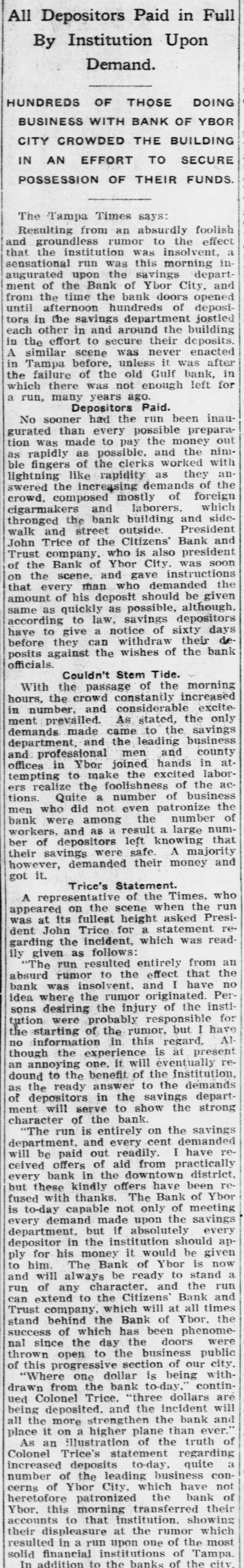 All Depositors Paid in Full By Institution Upon Demand. HUNDREDS OF THOSE DOING BUSINESS WITH BANK OF YBOR CITY CROWDED THE BUILDING IN AN EFFORT TO SECURE POSSESSION OF THEIR FUNDS. The Tampa Times says: Resulting from an absurdly foolish and groundless rumor to the effect that the institution was insolvent, a sensational run was this morning inaugurated upon the savings department of the Bank of Ybor City, and from the time the bank doors opened until afternoon hundreds of depositors in the savings department jostled each other in and around the building in the effort to secure their deposits. A similar scene was never enacted in Tampa before, unless it was after the failure of the old Gulf bank, in which there was not enough left for a run, many years ago. Depositors Paid. No sooner had the run been inaugurated than every possible preparation was made to pay the money out as rapidly as possible, and the nimble fingers of the clerks worked with lightning like rapidity as they answered the increasing demands of the crowd, composed mostly of foreign cigarmakers and laborers, which thronged the bank building and sidewalk and street outside. President John Trice of the Citizens' Bank and Trust company, who is also president of the Bank of Ybor City, was soon on the scene, and gave instructions that every man who demanded the amount of his deposit should be given same as quickly as possible, although, according to law, savings depositors have to give a notice of sixty days before they can withdraw their deposits against the wishes of the bank officials. Couldn't Stem Tide. With the passage of the morning hours, the crowd constantly increased in number, and considerable excitement prevailed. As stated, the only demands made came to the savings department, and the leading business and professional men and county offices in Ybor joined hands in attempting to make the excited laborers realize the foolishness of the actions. Quite a number of business men who did not even patronize the bank were among the number of workers, and as a result a large number of depositors left knowing that their savings were safe. A majority however, demanded their money and got it. Trice's Statement. A representative of the Times, who appeared on the scene when the run was at its fullest height asked President John Trice for a statement regarding the incident, which was readily given as follows: "The run resulted entirely from an absurd rumor to the effect that the bank was insolvent, and I have no idea where the rumor originated. Persons desiring the injury of the institution were probably responsible for the starting of the rumor, but I have no information in this regard. Although the experience is at present an annoying one, it. will eventually redound to the benefit of the institution, as the ready answer to the demands of depositors in the savings department will serve to show the strong character of the bank. "The run is entirely on the savings department, and every cent demanded will be paid out readily. I have received offers of aid from practically every bank in the downtown district, but these kindly offers have been refused with thanks. The Bank of Ybor is to-day capable not only of meeting every demand made upon the savings department, but if absolutely every depositor in the institution should apply for his money it would be given