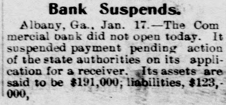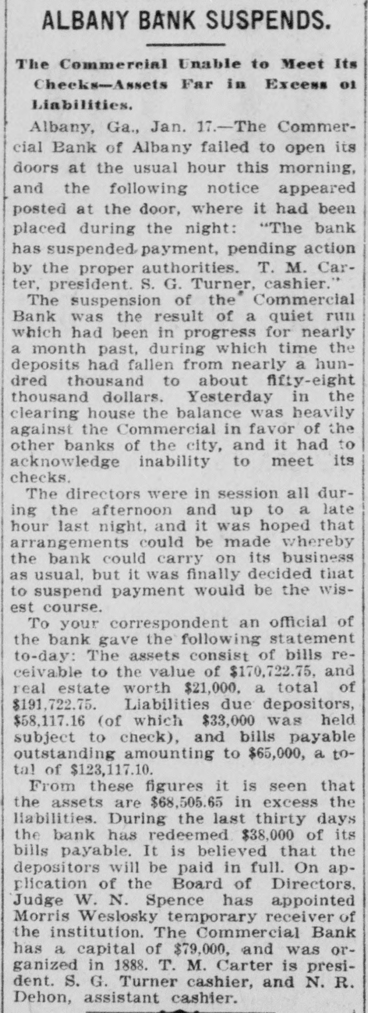 ALBANY BANK SUSPENDS. The Commercial Unable to Meet Its Checks-Assets Far in Excess 01 Liabilities. Albany, Ga., Jan. 17.-The Commercial Bank of Albany failed to open its doors at the usual hour this morning, and the following notice appeared posted at the door, where it had been placed during the night: "The bank has suspended payment, pending action by the proper authorities. T. M. Carter, president. S. G. Turner, cashier." The suspension of the Commercial Bank was the result of a quiet run which had been in progress for nearly a month past, during which time the deposits had fallen from nearly a hundred thousand to about fifty-eight thousand dollars. Yesterday in the clearing house the balance was heavily against the Commercial in favor of the other banks of the city, and it had to acknowledge inability to meet its checks. The directors were in session all during the afternoon and up to a late hour last night, and it was hoped that arrangements could be made whereby the bank could carry on its business as usual, but it was finally decided that to suspend payment would be the wisest course. To your correspondent an official of the bank gave the following statement to-day: The assets consist of bills receivable to the value of $170,722.75, and real estate worth $21,000. a total of $191,722.75. Liabilities due depositors, $58,117.16 (of which $33,000 was held subject to check), and bills payable outstanding amounting to $65,000, a total of $123,117.10. From these figures it is seen that the assets are $68,505.65 in excess the liabilities. During the last thirty days the bank has redeemed $38,000 of its bills payable. It is believed that the depositors will be paid in full. On application of the Board of Directors. Judge W. N. Spence has appointed Morris Weslosky temporary receiver of the institution. The Commercial Bank has a capital of $79,000, and was organized in 1888. T. M. Carter is president. S. G. Turner cashier, and N. R. Dehon, assistant cashier.