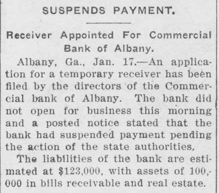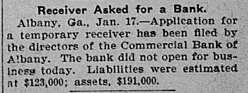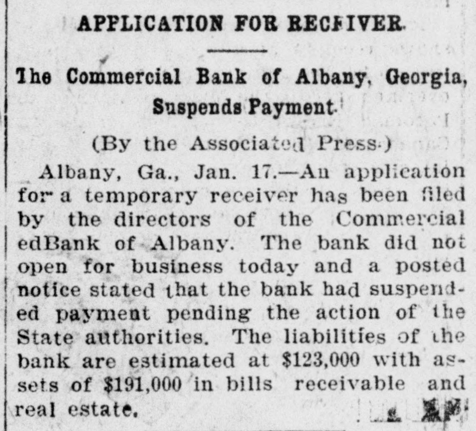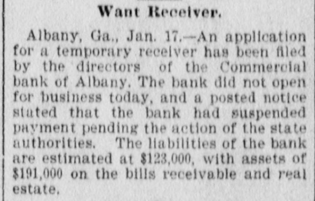 APPLICATION FOR RECEIVER The Commercial Bank of Albany, Georgia, Suspends Payment (By the Associated Press.) Albany, Ga., Jan. 17.-An application for a temporary receiver has been filed by the directors of the Commercial edBank of Albany. The bank did not open for business today and a posted notice stated that the bank had suspended payment pending the action of the State authorities. The liabilities of the bank are estimated at $123,000 with assets of $191,000 in bills receivable and real estate.