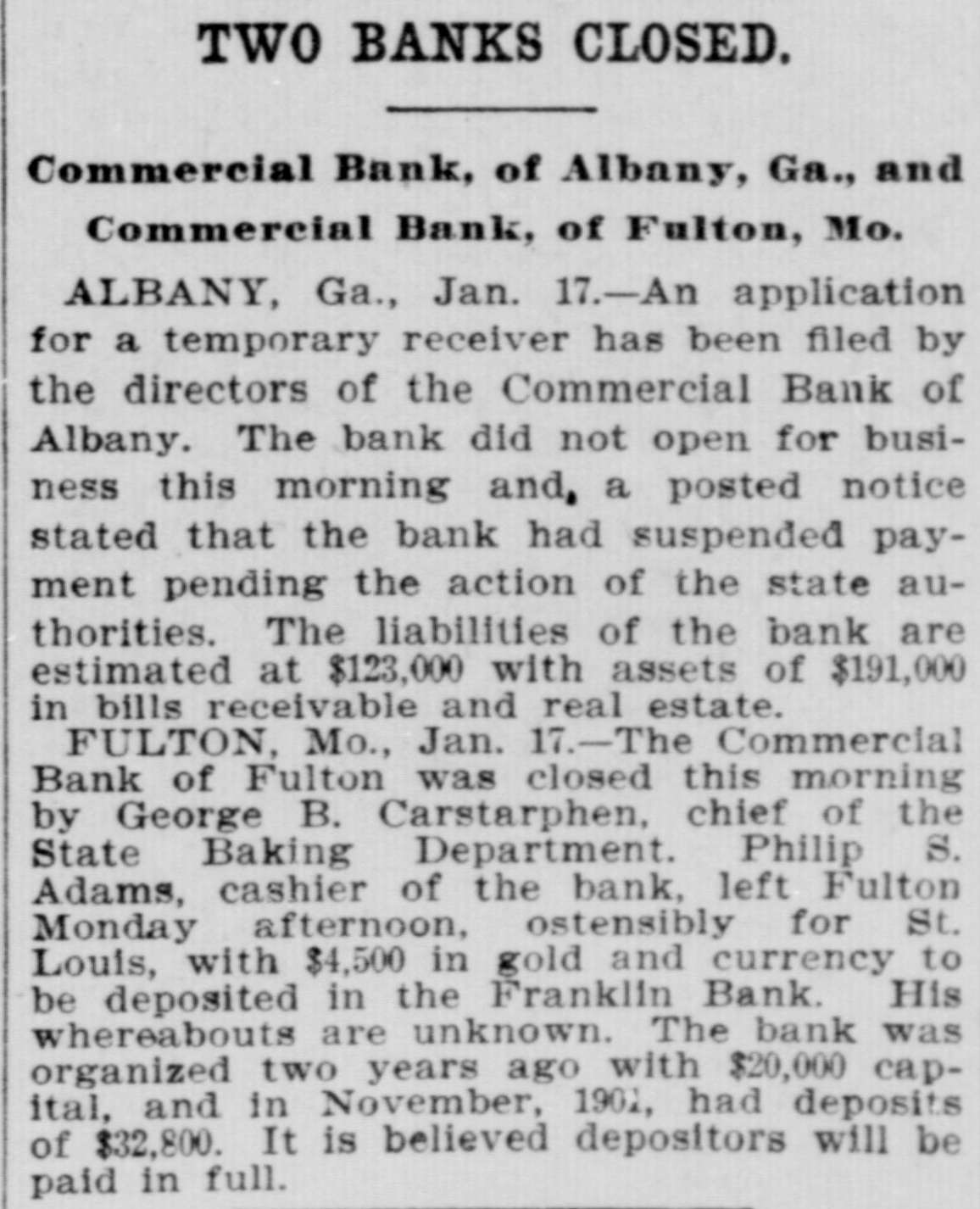 TWO BANKS CLOSED. Commercial Bank, of Albany, Ga., and Commercial Bank, of Fulton, Mo. ALBANY, Ga., Jan. 17.-An application for a temporary receiver has been filed by the directors of the Commercial Bank of Albany. The bank did not open for business this morning and, a posted notice stated that the bank had suspended payment pending the action of the state authorities. The liabilities of the bank are estimated at $123,000 with assets of $191,000 in bills receivable and real estate. FULTON, Mo., Jan. .-The Commercial Bank of Fulton was closed this morning by George B. Carstarphen, chief of the State Baking Department. Philip S. Adams, cashier of the bank, left Fulton Monday afternoon, ostensibly for St. Louis, with $4,500 in gold and currency to His be deposited in the Franklin Bank. whereabouts are unknown. The bank was organized two years ago with $20,000 capital, and in November, 1901, had deposits of $32,800. It is believed depositors will be paid in full.