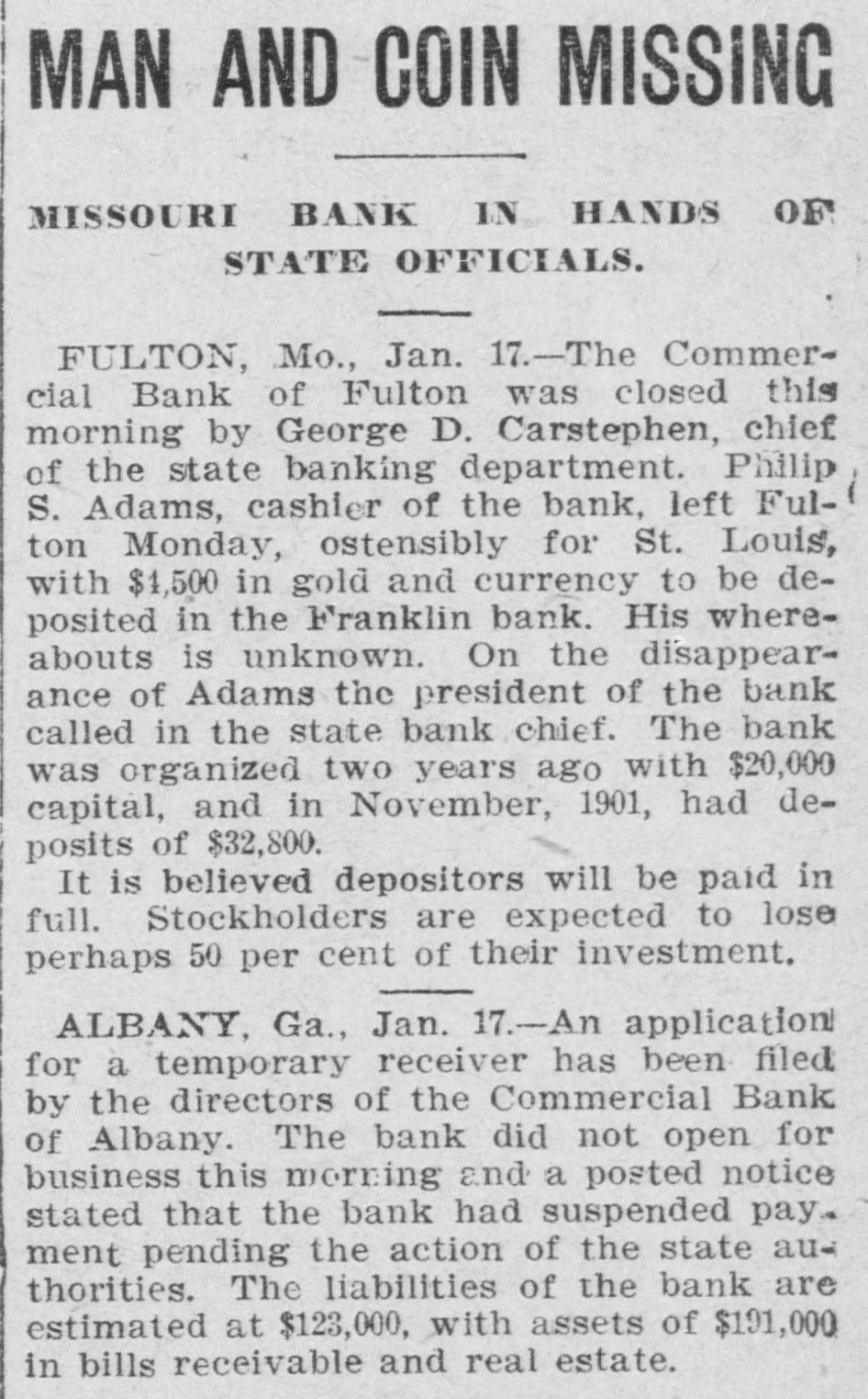 MAN AND / COIN MISSING MISSOURI BANK IN HANDS OF STATE OFFICIALS. FULTON, Mo., Jan. 17.-The Commercial Bank of Fulton was closed this morning by George D. Carstephen, chief of the state banking department. Philip S. Adams, cashier of the bank, left Fulton Monday, ostensibly for St. Louis, with $1,500 in gold and currency to be deposited in the Franklin bank. His whereabouts is unknown. On the disappearance of Adams the president of the bank called in the state bank chief. The bank was organized two years ago with $20,000 capital, and in November, 1901, had deposits of $32,800. It is believed depositors will be paid in full. Stockholders are expected to lose perhaps 50 per cent of their investment. ALBANY, Ga., Jan. 17.-An application for a temporary receiver has been filed by the directors of the Commercial Bank of Albany. The bank did not open for business this morning and a posted notice stated that the bank had suspended pay. ment pending the action of the state authorities. The liabilities of the bank are estimated at $123,000, with assets of $191,000 in bills receivable and real estate.