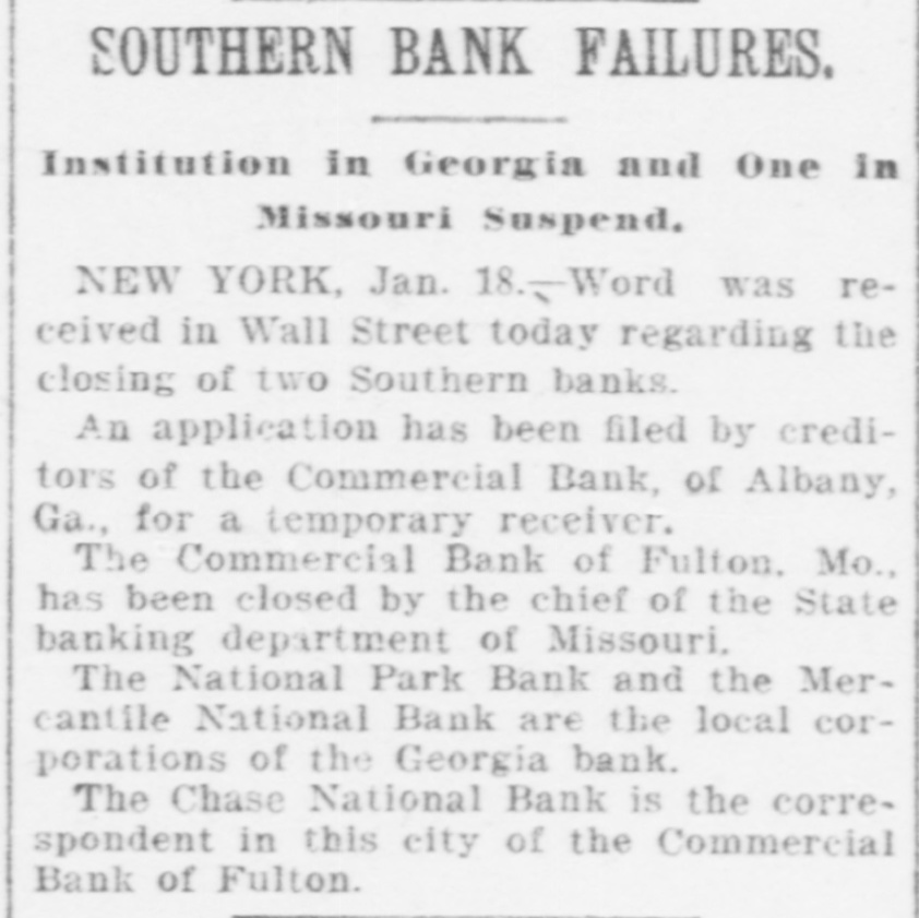 SOUTHERN BANK FAILURES. Institution in Georgia and One in Missouri Suspend. NEW YORK, Jan. 18.-Word was received in Wall Street today regarding the closing of two Southern banks. An application has been filed by creditors of the Commercial Bank, of Albany, Ga., for a temporary receiver. The Commercial Bank of Fulton. Mo., has been closed by the chief of the State banking department of Missouri. The National Park Bank and the Mercantile National Bank are the local corporations of the Georgia bank. The Chase National Bank is the correspondent in this city of the Commercial Bank of Fulton.