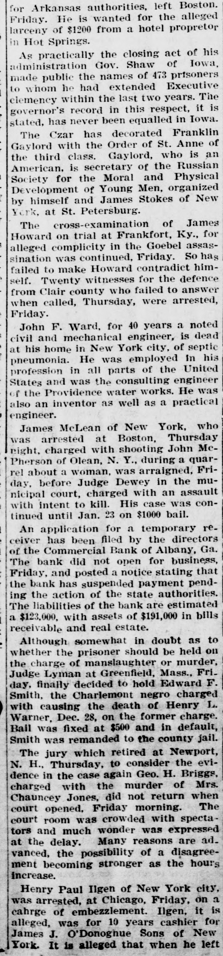 for Arkansas authorities, left Boston. Friday. He is wanted for the alleged larceny of $1200 from a hotel propretor in Hot Springs. As practically the closing act of his administration Gov. Shaw of Iowa, made public the names of 473 prisoners to whom he had extended Executive elemency within the last two years. The governor's record in this respect, it is stated, has never been equalled in Iowa. The Czar has decorated Franklin Gaylord with the Order of St. Anne of the third class. Gaylord, who is an American, is secretary of the Russian Society for the Moral and Physical Development of Young Men, organized by himself and James Stokes of New York, at St. Petersburg. The cross-examination of James Howard on trial at Frankfort, Ky., for alleged complicity in the Goebel assassination was continued, Friday. So has failed to make Howard contradict himself. Twenty witnesses for the defence from Clair county who failed to answer when called, Thursday, were arrested, Friday. John F. Ward, for 40 years a noted civil and mechanical engineer, is dead at his home in New York city, of septic pneumonia. He was employed in his profession in all parts of the United States and was the consulting engineer of the Providence water works. He was also an inventor as well as a practical engineer. James McLean of New York, who was arrested at Boston, Thursday eight, charged with shooting John McPherson of Olean, N. Y., during a quarrel about a woman, was arraigned, Friday, before Judge Dewey in the muinicipal court, charged with an assault with intent to kill. His case was continued until Jan. 23 on $1000 bail. An application for a temporary receiver has been filed by the directors of the Commercial Bank of Albany, Ga. The bank did not open for business, Friday, and posted a notice stating that the bank has suspended payment pending the action of the state authorities. The liabilities of the bank are estimated a $123,000, with assets of $191,000 in bills receivable and real estate. Although somewhat in doubt as to whether the prisoner should be held on the charge of manslaughter or murder, Judge Lyman at Greenfield, Mass., Friday, finally decided to hold Edward F. Smith, the Charlemont negro charged with causing the death of Henry L. Warner, Dec. 28, on the former charge. Bail was fixed at $500 and in default, Smith was remanded to the county jail. The jury which retired at Newport, N. H., Thursday, to consider the evidence in the case again Geo. H. Briggs, charged with the murder of Mrs. Chauncey Jones, did not return when court opened, Friday morning. The court room was crowded with spectators and much wonder was expressed at the delay. Many reasons are ad. vanced, the possibility of a disagreement becoming stronger as the hours increase. Henry Paul Ilgen of New York city, was arrested, at Chicago, Friday, on a cahrge of embezzlement. Ilgen, it is alleged, was for 10 years cashier for James J. O'Donoghue Sons of New York. It is alleged that when he left
