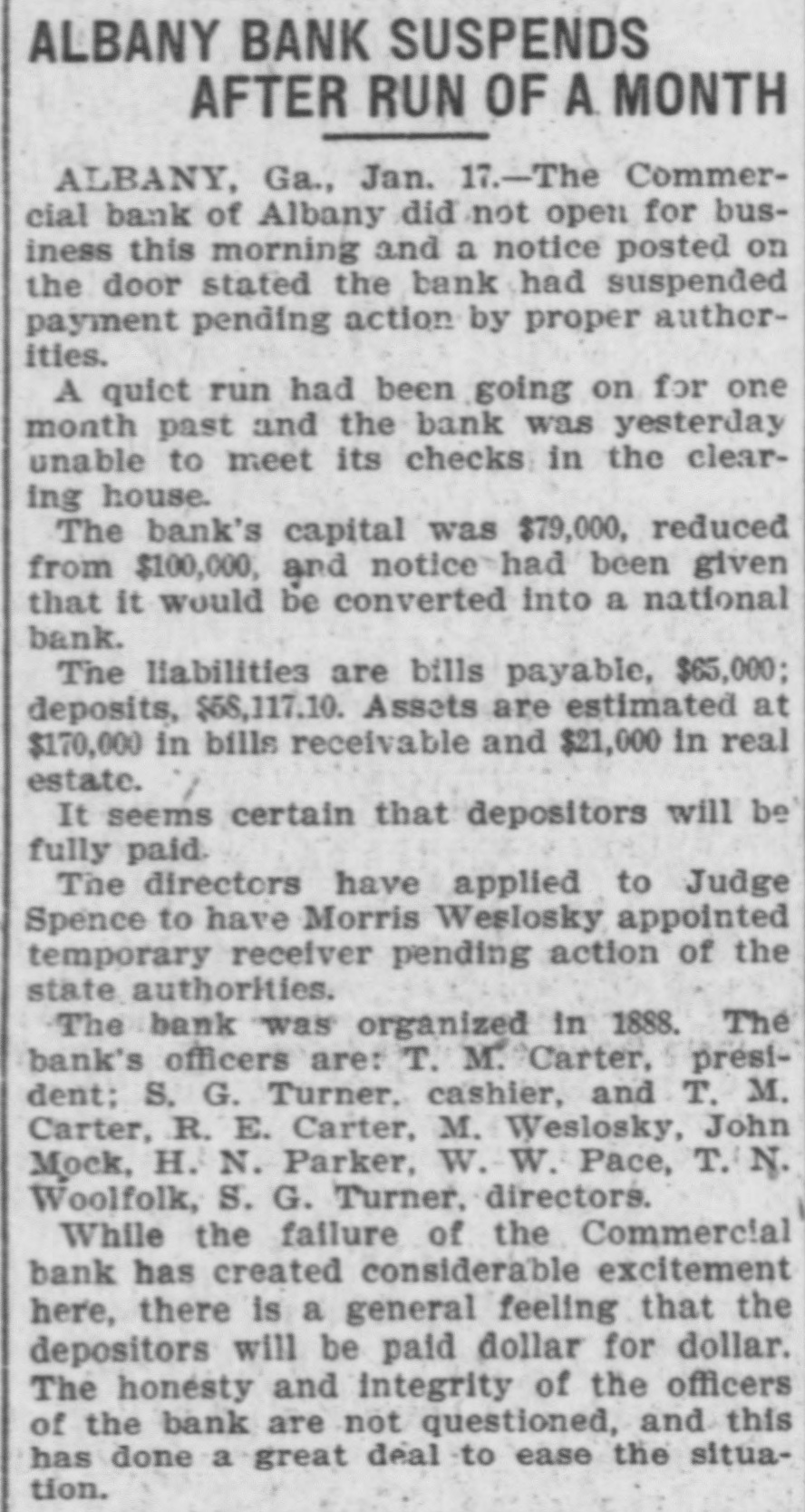 ALBANY BANK SUSPENDS AFTER RUN OF A. MONTH ALBANY, Ga., Jan. 17.-The Commercial bank of Albany did not open for business this morning and a notice posted on the door stated the bank had suspended payment pending action by proper authorities. A quiet run had been going on for one month past and the bank was yesterday unable to meet its checks in the clearing house. The bank's capital was $79,000, reduced from $100,000, and notice had been given that it would be converted into a national bank. The liabilities are bills payable, $65,000; deposits, $58,117.10. Assets are estimated at $170,000 in bills receivable and $21,000 in real estate. It seems certain that depositors will be fully paid. The directors have applied to Judge Spence to have Morris Weslosky appointed temporary receiver pending action of the state authorities. The bank was organized in 1888. The bank's officers are: T. M. Carter, president: S. G. Turner. cashier, and T. M. Carter, R. E. Carter, M. Weslosky, John Mock, H. N. Parker, W. W. Pace, T. N. Woolfolk, S. G. Turner, directors. While the failure of the Commercial bank has created considerable excitement here, there is a general feeling that the depositors will be paid dollar for dollar. The honesty and integrity of the officers of the bank are not questioned, and this has done a great deal to lease the situation.