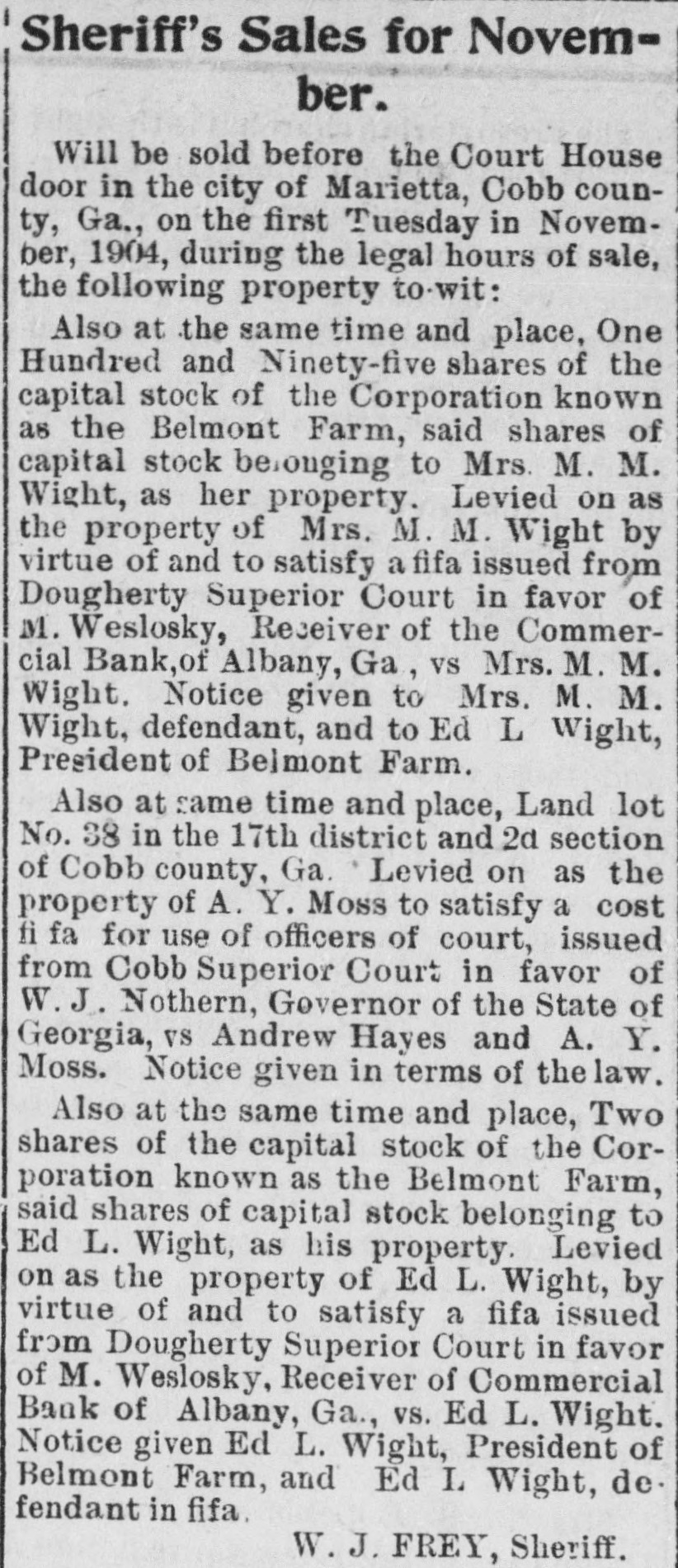 # Sheriff's Sales for November. Will be sold before the Court House door in the city of Marietta, Cobb county, Ga., on the first Tuesday in November, 1904, during the legal hours of sale, the following property to-wit: Also at the same time and place, One Hundred and Ninety-five shares of the capital stock of the Corporation known as the Belmont Farm, said shares of capital stock belonging to Mrs. M. M. Wight, as her property. Levied on as the property of Mrs. M. M. Wight by virtue of and to satisfy a fifa issued from Dougherty Superior Court in favor of M. Weslosky, Receiver of the Commercial Bank, of Albany, Ga, vs Mrs. M. M. Wight. Notice given to Mrs. M. M. Wight, defendant, and to Ed L Wight, President of Belmont Farm. Also at same time and place, Land lot No. 38 in the 17th district and 2d section of Cobb county, Ga. Levied on as the property of A. Y. Moss to satisfy a cost fi fa for use of officers of court, issued from Cobb Superior Court in favor of W. J. Nothern, Governor of the State of Georgia, vs Andrew Hayes and A. Y. Moss. Notice given in terms of the law. Also at the same time and place, Two shares of the capital stock of the Corporation known as the Belmont Farm, said shares of capital stock belonging to Ed L. Wight, as his property. Levied on as the property of Ed L. Wight, by virtue of and to satisfy a fifa issued from Dougherty Superior Court in favor of M. Weslosky, Receiver of Commercial Bank of Albany, Ga., vs. Ed L. Wight. Notice given Ed L. Wight, President of Belmont Farm, and Ed L. Wight, defendant in fifa. W. J. FREY, Sheriff.