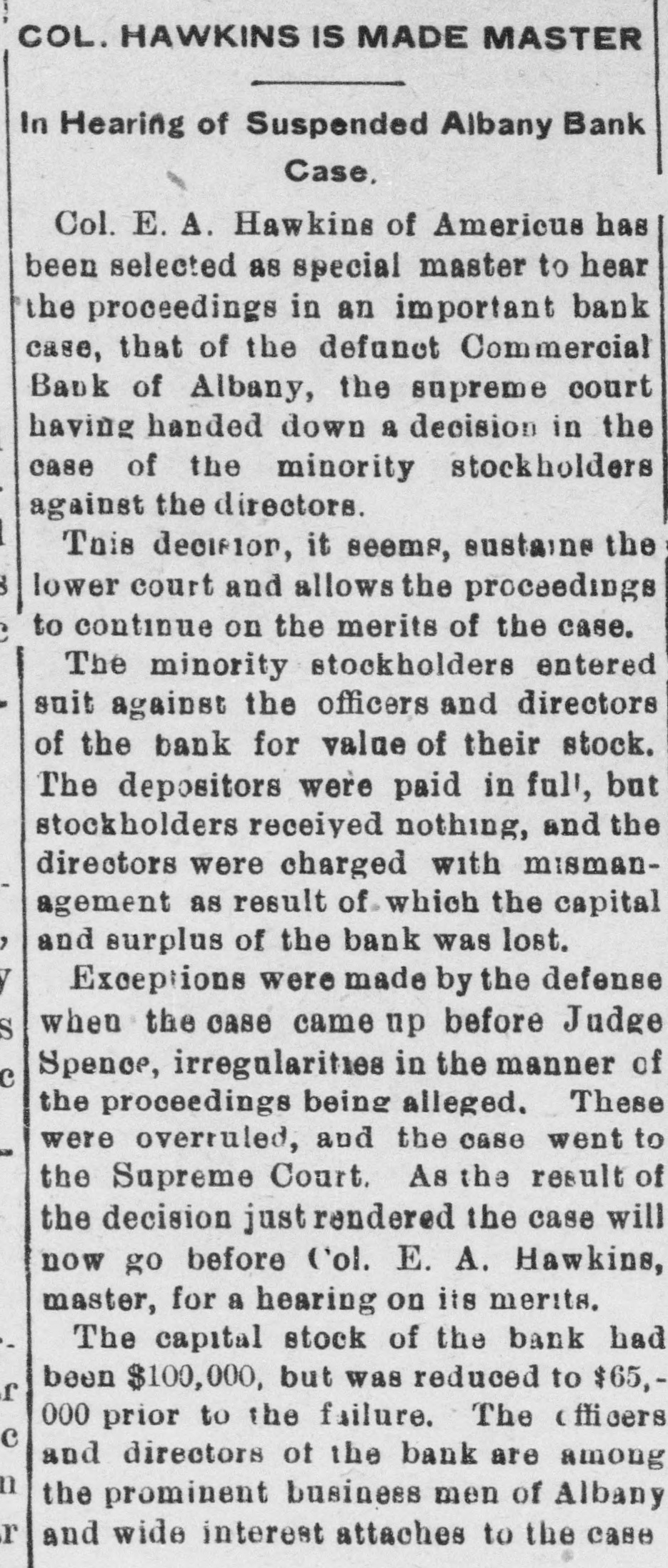 # COL. HAWKINS IS MADE MASTER In Hearing of Suspended Albany Bank Case. Col. E. A. Hawkins of Americus has been selected as special master to hear the proceedings in an important bank case, that of the defunct Commercial Bank of Albany, the supreme court having handed down a decision in the case of the minority stockholders against the directors. This decisior, it seems, sustaine the lower court and allows the proceedings to continue on the merits of the case. The minority stockholders entered suit against the officers and directors of the bank for value of their stock. The depositors were paid in ful, but stockholders received nothing, and the directors were charged with mismanagement as result of which the capital and surplus of the bank was lost. Exceptions were made by the defense when the case came up before Judge Spence, irregularities in the manner of the proceedings being alleged. These were overruled, and the case went to the Supreme Court. As the result of the decision just rendered the case will now go before Col. E. A. Hawkins, master, for a hearing on its merits. The capital stock of the bank had been $100,000, but was reduced to $65,000 prior to the failure. The officers and directors of the bank are among the prominent business men of Albany and wide interest attaches to the case.
