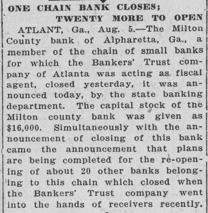 Another Georgia Bank Has to Close Its Doors Atlanta, Ga., Aug. 6 (AP)The Milton county bank of Alpharetta. Ga., a member of the chain of banks for which the Bankers Trust company of Atlanta was acting fiscal agent, closed yesterday, it is announced by the state banking department. The capital stock of the Milton county bank was given as $16,000. Simultaneouswith the announcement of closing of this bank came the announcement that plans are being completed for the reopening of about twenty other banks belonging to this chain which closed when the Bankers' Trust company went into the hands of receivers recently.