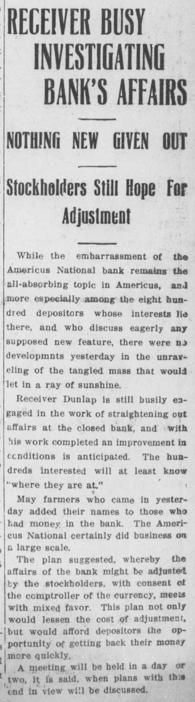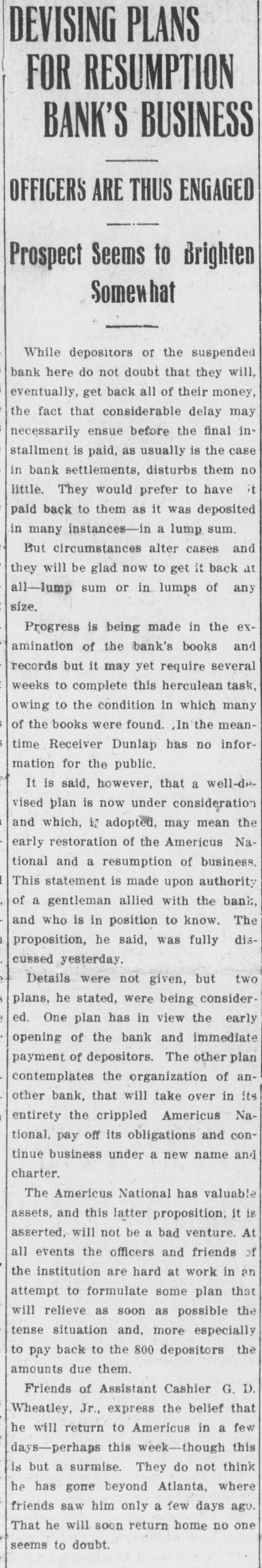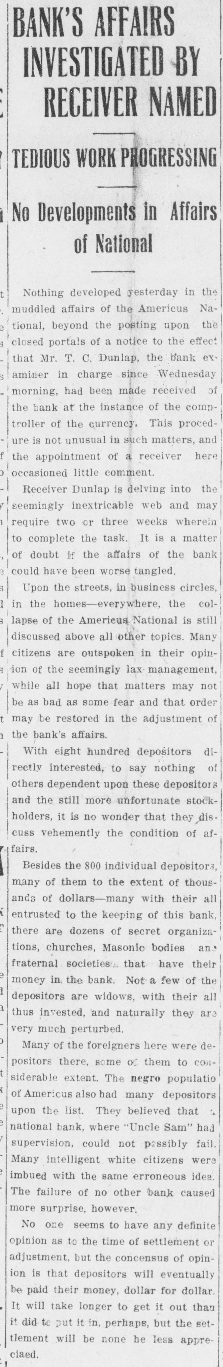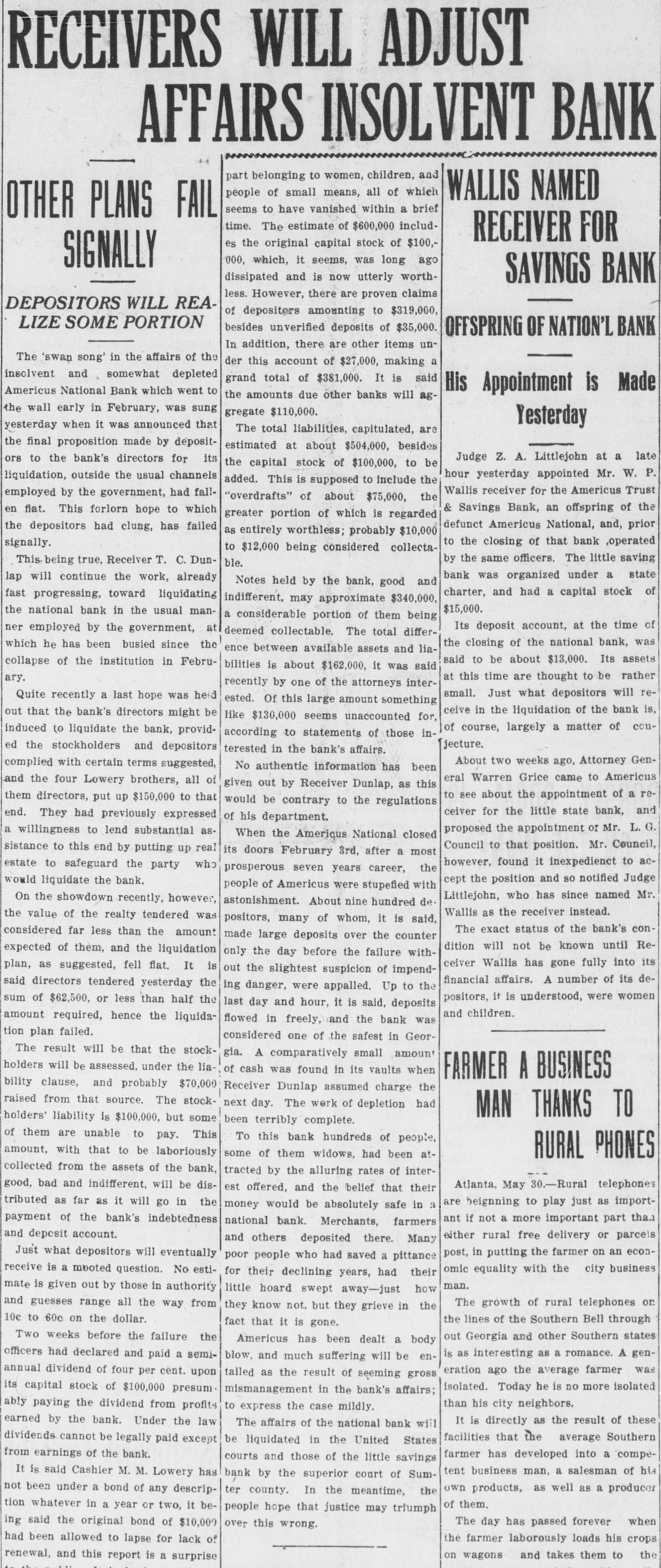 RECEIVERS WILL ADJUST AFFAIRS INSOLVENT BANK 48 part belonging to women, children, and people of small means, all of which WALLIS NAMED seems to have vanished within a brief FAIL OTHER PLANS time. The estimate of $600,000 includRECEIVER FOR es the original capital stock of $100,000, which, it seems, was long ago SIGNALLY dissipated and is now utterly worthSAVINGS BANK less. However, there are proven claims DEPOSITORS WILL REAof depositors amounting to $319,000, LIZE SOME PORTION besides unverified deposits of $35,000. OFFSPRING OF NATION'L BANK In addition, there are other items unThe 'swap song' in the affairs of the der this account of $27,000, making a insolvent and somewhat depleted grand total of $381,000. It is said Americus National Bank which went to His Appointment is Made the amounts due other banks will agthe wall early in February, was sung gregate $110,000. Yesterday yesterday when it was announced that The total liabilities, capitulated, are the final proposition made by depositestimated at about $504,000, besides Judge Z. A. Littlejohn at a late ors to the bank's directors for its the capital stock of $100,000, to be hour yesterday appointed Mr. W. P. liquidation, outside the usual channels added. This is supposed to include the Wallis receiver for the Americus Trust employed by the government, had fall"overdrafts" of about $75,000, the & Savings Bank, an offspring of the en flat. This forlorn hope to which greater portion of which is regarded defunct Americus National, and, prior the depositors had clung, has failed as entirely worthless; probably $10,000 to the closing of that bank ,operated signally. to $12,000 being considered collectaby the same officers. The little saving This being true, Receiver T. C. Dunble. bank was organized under a state lap will continue the work, already Notes held by the bank, good and charter, and had a capital stock of fast progressing, toward liquidating indifferent, may approximate $340,000, $15,000. the national bank in the usual mana considerable portion of them being Its deposit account, at the time of ner employed by the government, at deemed collectable. The total differthe closing of the national bank, was which he has been busied since the ence between available assets and liasaid to be about $13,000. Its assets collapse of the institution in Februbilities is about $162,000, it was said at this time are thought to be rather ary. recently by one of the attorneys intersmall. Just what depositors will reQuite recently a last hope was held ested. Of this large amount something ceive in the liquidation of the bank is, out that the bank's directors might be like $130,000 seems unaccounted for, of course, largely a matter of couinduced to liquidate the bank, providaccording to statements of those injecture. ed the stockholders and depositors terested in the bank's affairs. About two weeks ago, Attorney Gencomplied with certain terms suggested, No authentic information has been eral Warren Grice came to Americus and the four Lowery brothers, all of given out by Receiver Dunlap, as this to see about the appointment of a rethem directors, put up $150,000 to that would be contrary to the regulations ceiver for the little state bank, and end. They had previously expressed of his department. proposed the appointment of Mr. L. G. a willingness to lend substantial asWhen the Americus National closed Council to that position. Mr. Council, sistance to this end by putting up real its doors February 3rd, after a most however, found it inexpedienct to acestate to safeguard the party who prosperous seven years career, the cept the position and so notified Judge would liquidate the bank. people of Americus were stupefied with Littlejohn, who has since named Mr. On the showdown recently, however, astonishment. About nine hundred deWallis as the receiver instead. the value of the realty tendered was positors, many of whom, it is said, The exact status of the bank's conconsidered far less than the amount made large deposits over the counter dition will not be known until Reexpected of them, and the liquidation only the day before the failure withceiver Wallis has gone fully into its plan, as suggested, fell flat, It is out the slightest suspicion of impendfinancial affairs. A number of its desaid directors tendered yesterday the ing danger, were appalled. Up to the positors, it is understood, were women sum of $62,500, or less than half the last day and hour, it is said, deposits and children. amount required, hence the liquidaflowed in freely, and the bank was tion plan failed. considered one of the safest in GeorThe result will be that the stockgia. A comparatively small amount holders will be assessed, under the liaof cash was found in its vaults when FARMER A BUSINESS bility clause, and probably $70,000 Receiver Dunlap assumed charge the raised from that source. The stocknext day. The work of depletion had MAN THANKS TO holders' liability is $100,000, but some been terribly complete. of them are unable to pay. This To this bank hundreds of people, amount, with that to be laboriously RURAL PHONES some of them widows, had been atcollected from the assets of the bank, tracted by the alluring rates of intergood, bad and indifferent, will be disAtlanta, May 30.-Rural telephones est offered, and the belief that their are beignning to play just as importtributed as far as it will go in the money would be absolutely safe in a payment of the bank's indebtedness ant if not a more important part than national bank. Merchants, farmers and deposit account. either rural free delivery or parcels and others deposited there. Many post, in putting the farmer on an econJust what depositors will eventually poor people who had saved a pittance omic equality with the city business receive is a mooted question. No estifor their declining years, had their man. mate is given out by those in authority little hoard swept away-just how The growth of rural telephones or and guess