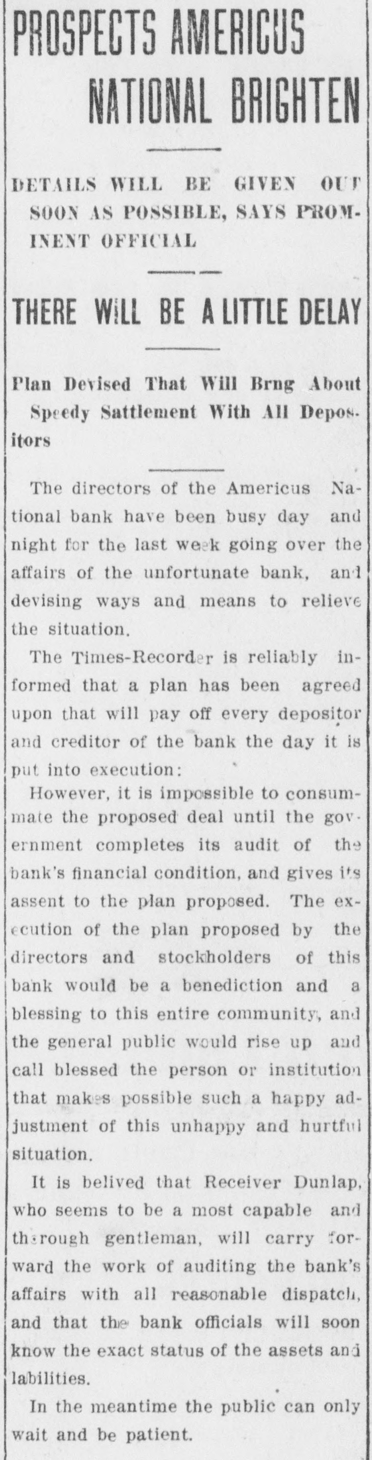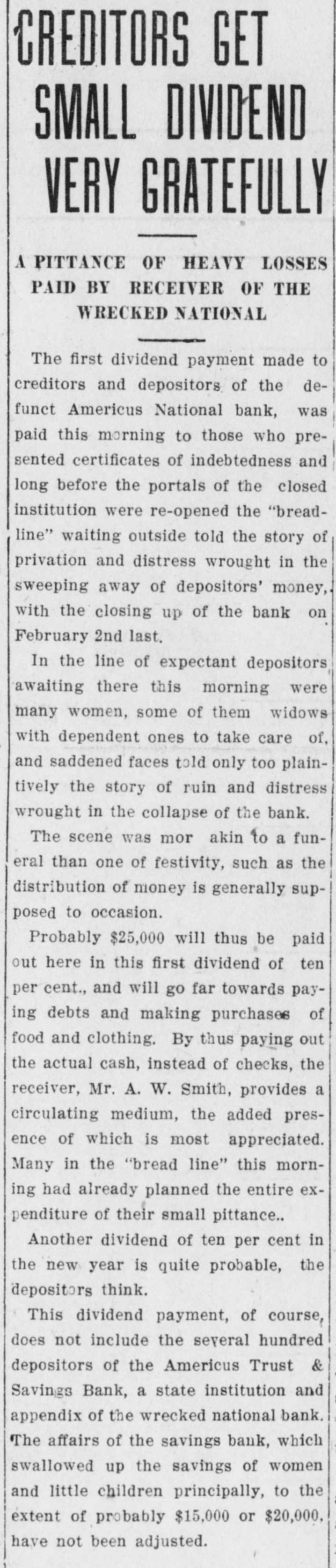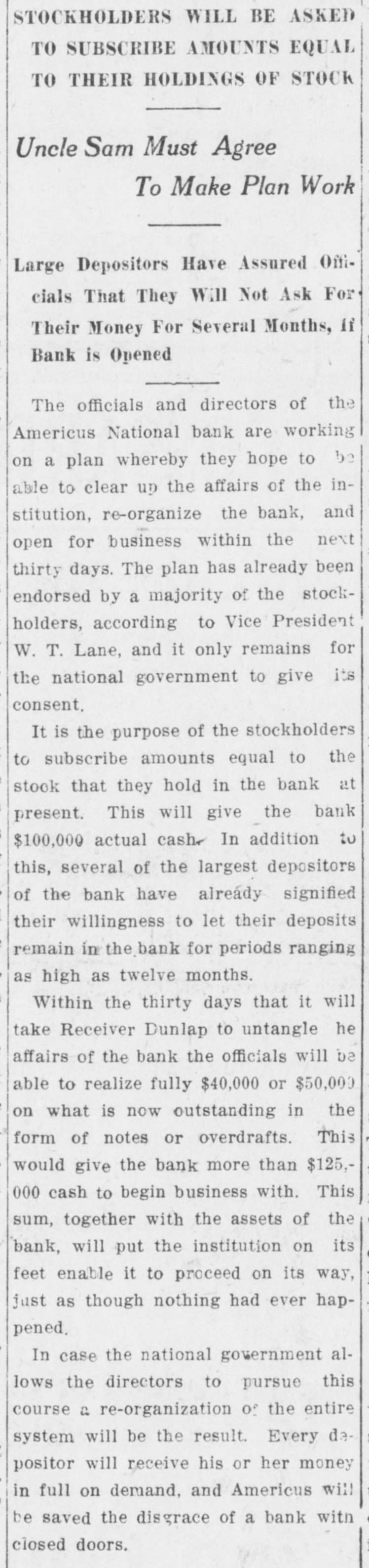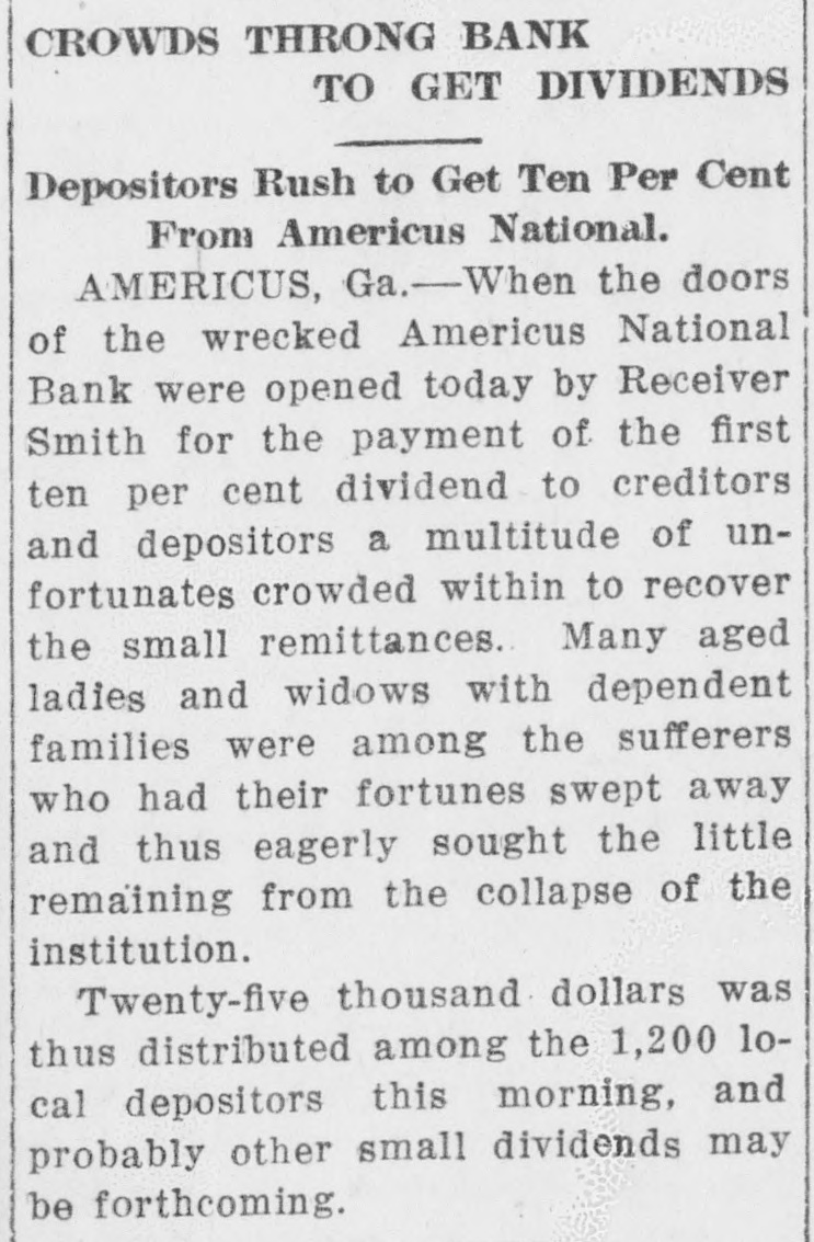 RECEIVERS WILL ADJUST AFFAIRS INSOLVENT BANK 48 part belonging to women, children, and people of small means, all of which WALLIS NAMED seems to have vanished within a brief FAIL OTHER PLANS time. The estimate of $600,000 includRECEIVER FOR es the original capital stock of $100,000, which, it seems, was long ago SIGNALLY dissipated and is now utterly worthSAVINGS BANK less. However, there are proven claims DEPOSITORS WILL REAof depositors amounting to $319,000, LIZE SOME PORTION besides unverified deposits of $35,000. OFFSPRING OF NATION'L BANK In addition, there are other items unThe 'swap song' in the affairs of the der this account of $27,000, making a insolvent and somewhat depleted grand total of $381,000. It is said Americus National Bank which went to His Appointment is Made the amounts due other banks will agthe wall early in February, was sung gregate $110,000. Yesterday yesterday when it was announced that The total liabilities, capitulated, are the final proposition made by depositestimated at about $504,000, besides Judge Z. A. Littlejohn at a late ors to the bank's directors for its the capital stock of $100,000, to be hour yesterday appointed Mr. W. P. liquidation, outside the usual channels added. This is supposed to include the Wallis receiver for the Americus Trust employed by the government, had fall"overdrafts" of about $75,000, the & Savings Bank, an offspring of the en flat. This forlorn hope to which greater portion of which is regarded defunct Americus National, and, prior the depositors had clung, has failed as entirely worthless; probably $10,000 to the closing of that bank ,operated signally. to $12,000 being considered collectaby the same officers. The little saving This being true, Receiver T. C. Dunble. bank was organized under a state lap will continue the work, already Notes held by the bank, good and charter, and had a capital stock of fast progressing, toward liquidating indifferent, may approximate $340,000, $15,000. the national bank in the usual mana considerable portion of them being Its deposit account, at the time of ner employed by the government, at deemed collectable. The total differthe closing of the national bank, was which he has been busied since the ence between available assets and liasaid to be about $13,000. Its assets collapse of the institution in Februbilities is about $162,000, it was said at this time are thought to be rather ary. recently by one of the attorneys intersmall. Just what depositors will reQuite recently a last hope was held ested. Of this large amount something ceive in the liquidation of the bank is, out that the bank's directors might be like $130,000 seems unaccounted for, of course, largely a matter of couinduced to liquidate the bank, providaccording to statements of those injecture. ed the stockholders and depositors terested in the bank's affairs. About two weeks ago, Attorney Gencomplied with certain terms suggested, No authentic information has been eral Warren Grice came to Americus and the four Lowery brothers, all of given out by Receiver Dunlap, as this to see about the appointment of a rethem directors, put up $150,000 to that would be contrary to the regulations ceiver for the little state bank, and end. They had previously expressed of his department. proposed the appointment of Mr. L. G. a willingness to lend substantial asWhen the Americus National closed Council to that position. Mr. Council, sistance to this end by putting up real its doors February 3rd, after a most however, found it inexpedienct to acestate to safeguard the party who prosperous seven years career, the cept the position and so notified Judge would liquidate the bank. people of Americus were stupefied with Littlejohn, who has since named Mr. On the showdown recently, however, astonishment. About nine hundred deWallis as the receiver instead. the value of the realty tendered was positors, many of whom, it is said, The exact status of the bank's conconsidered far less than the amount made large deposits over the counter dition will not be known until Reexpected of them, and the liquidation only the day before the failure withceiver Wallis has gone fully into its plan, as suggested, fell flat, It is out the slightest suspicion of impendfinancial affairs. A number of its desaid directors tendered yesterday the ing danger, were appalled. Up to the positors, it is understood, were women sum of $62,500, or less than half the last day and hour, it is said, deposits and children. amount required, hence the liquidaflowed in freely, and the bank was tion plan failed. considered one of the safest in GeorThe result will be that the stockgia. A comparatively small amount holders will be assessed, under the liaof cash was found in its vaults when FARMER A BUSINESS bility clause, and probably $70,000 Receiver Dunlap assumed charge the raised from that source. The stocknext day. The work of depletion had MAN THANKS TO holders' liability is $100,000, but some been terribly complete. of them are unable to pay. This To this bank hundreds of people, amount, with that to be laboriously RURAL PHONES some of them widows, had been atcollected from the assets of the bank, tracted by the alluring rates of intergood, bad and indifferent, will be disAtlanta, May 30.-Rural telephones est offered, and the belief that their are beignning to play just as importtributed as far as it will go in the money would be absolutely safe in a payment of the bank's indebtedness ant if not a more important part than national bank. Merchants, farmers and deposit account. either rural free delivery or parcels and others deposited there. Many post, in putting the farmer on an econJust what depositors will eventually poor people who had saved a pittance omic equality with the city business receive is a mooted question. No estifor their declining years, had their man. mate is given out by those in authority little hoard swept away-just how The growth of rural telephones or and guess