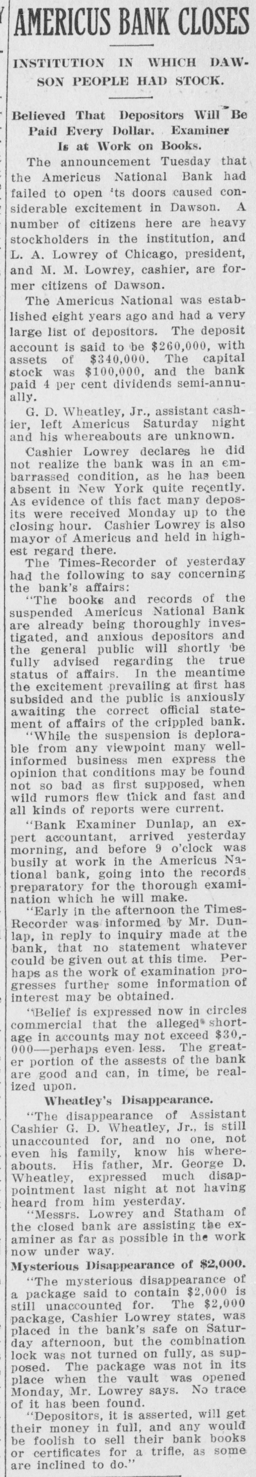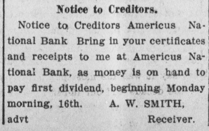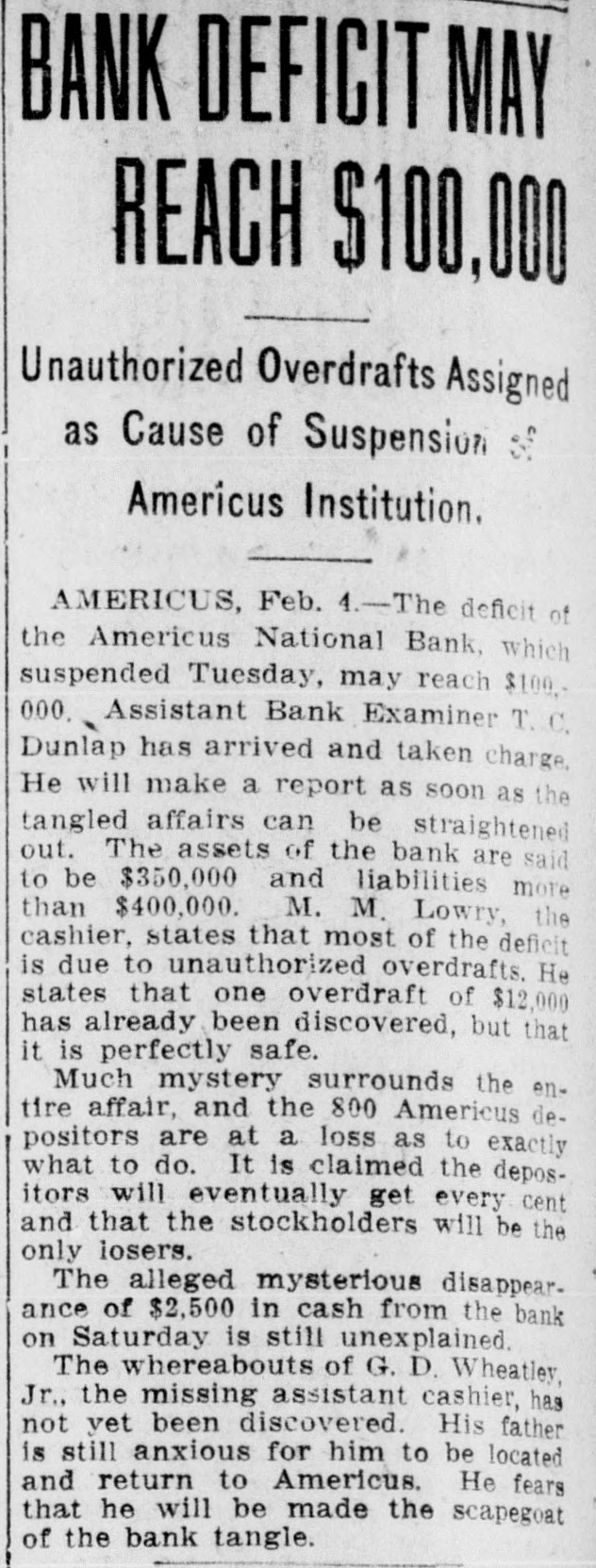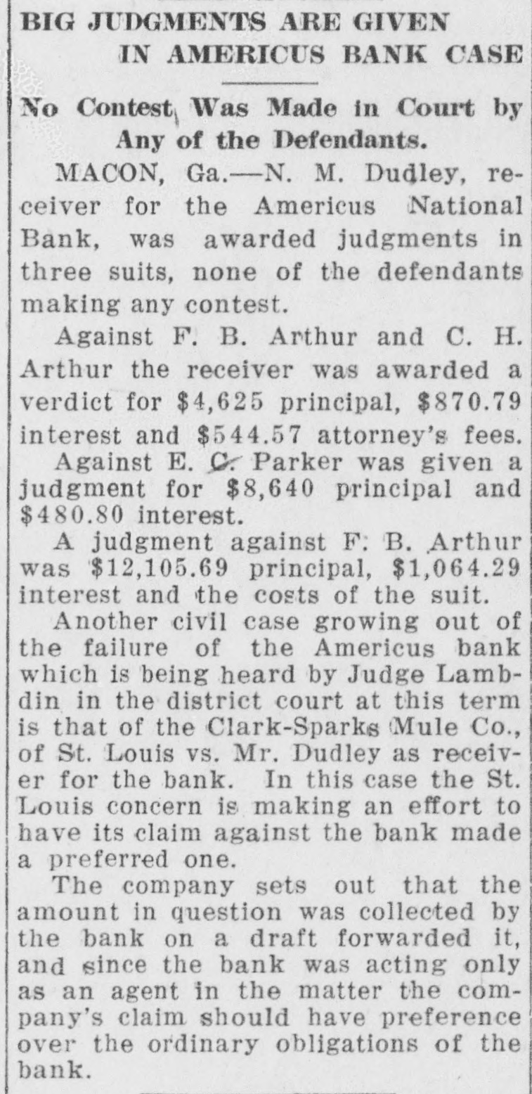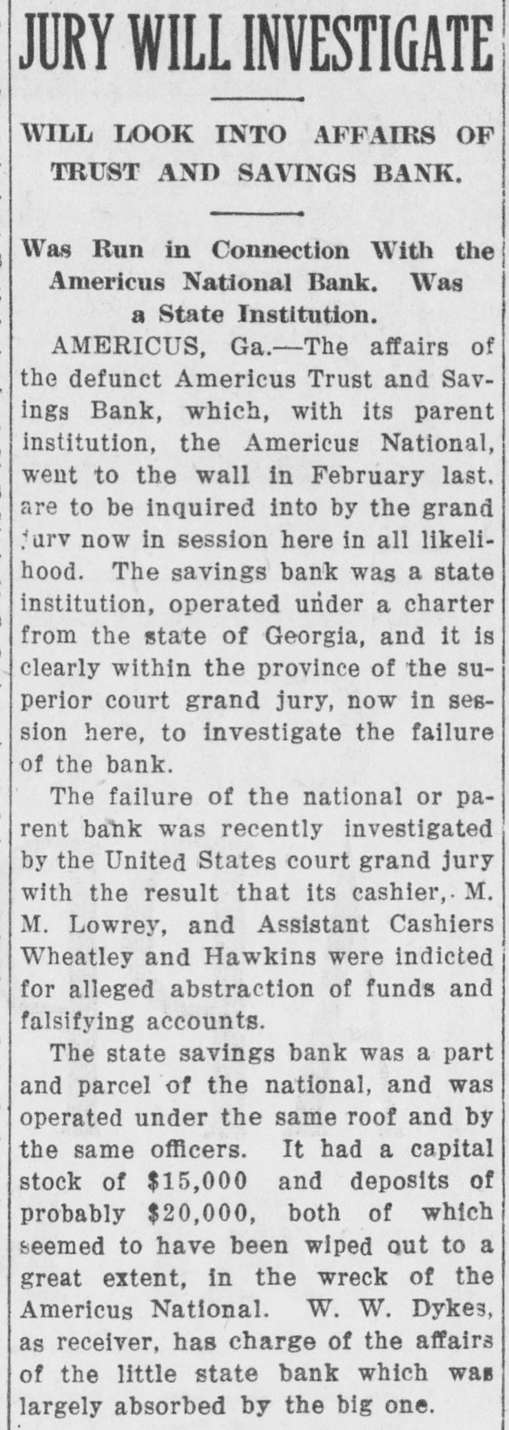 RECEIVERS WILL ADJUST AFFAIRS INSOLVENT BANK 48 part belonging to women, children, and people of small means, all of which WALLIS NAMED seems to have vanished within a brief FAIL OTHER PLANS time. The estimate of $600,000 includRECEIVER FOR es the original capital stock of $100,000, which, it seems, was long ago SIGNALLY dissipated and is now utterly worthSAVINGS BANK less. However, there are proven claims DEPOSITORS WILL REAof depositors amounting to $319,000, LIZE SOME PORTION besides unverified deposits of $35,000. OFFSPRING OF NATION'L BANK In addition, there are other items unThe 'swap song' in the affairs of the der this account of $27,000, making a insolvent and somewhat depleted grand total of $381,000. It is said Americus National Bank which went to His Appointment is Made the amounts due other banks will agthe wall early in February, was sung gregate $110,000. Yesterday yesterday when it was announced that The total liabilities, capitulated, are the final proposition made by depositestimated at about $504,000, besides Judge Z. A. Littlejohn at a late ors to the bank's directors for its the capital stock of $100,000, to be hour yesterday appointed Mr. W. P. liquidation, outside the usual channels added. This is supposed to include the Wallis receiver for the Americus Trust employed by the government, had fall"overdrafts" of about $75,000, the & Savings Bank, an offspring of the en flat. This forlorn hope to which greater portion of which is regarded defunct Americus National, and, prior the depositors had clung, has failed as entirely worthless; probably $10,000 to the closing of that bank ,operated signally. to $12,000 being considered collectaby the same officers. The little saving This being true, Receiver T. C. Dunble. bank was organized under a state lap will continue the work, already Notes held by the bank, good and charter, and had a capital stock of fast progressing, toward liquidating indifferent, may approximate $340,000, $15,000. the national bank in the usual mana considerable portion of them being Its deposit account, at the time of ner employed by the government, at deemed collectable. The total differthe closing of the national bank, was which he has been busied since the ence between available assets and liasaid to be about $13,000. Its assets collapse of the institution in Februbilities is about $162,000, it was said at this time are thought to be rather ary. recently by one of the attorneys intersmall. Just what depositors will reQuite recently a last hope was held ested. Of this large amount something ceive in the liquidation of the bank is, out that the bank's directors might be like $130,000 seems unaccounted for, of course, largely a matter of couinduced to liquidate the bank, providaccording to statements of those injecture. ed the stockholders and depositors terested in the bank's affairs. About two weeks ago, Attorney Gencomplied with certain terms suggested, No authentic information has been eral Warren Grice came to Americus and the four Lowery brothers, all of given out by Receiver Dunlap, as this to see about the appointment of a rethem directors, put up $150,000 to that would be contrary to the regulations ceiver for the little state bank, and end. They had previously expressed of his department. proposed the appointment of Mr. L. G. a willingness to lend substantial asWhen the Americus National closed Council to that position. Mr. Council, sistance to this end by putting up real its doors February 3rd, after a most however, found it inexpedienct to acestate to safeguard the party who prosperous seven years career, the cept the position and so notified Judge would liquidate the bank. people of Americus were stupefied with Littlejohn, who has since named Mr. On the showdown recently, however, astonishment. About nine hundred deWallis as the receiver instead. the value of the realty tendered was positors, many of whom, it is said, The exact status of the bank's conconsidered far less than the amount made large deposits over the counter dition will not be known until Reexpected of them, and the liquidation only the day before the failure withceiver Wallis has gone fully into its plan, as suggested, fell flat, It is out the slightest suspicion of impendfinancial affairs. A number of its desaid directors tendered yesterday the ing danger, were appalled. Up to the positors, it is understood, were women sum of $62,500, or less than half the last day and hour, it is said, deposits and children. amount required, hence the liquidaflowed in freely, and the bank was tion plan failed. considered one of the safest in GeorThe result will be that the stockgia. A comparatively small amount holders will be assessed, under the liaof cash was found in its vaults when FARMER A BUSINESS bility clause, and probably $70,000 Receiver Dunlap assumed charge the raised from that source. The stocknext day. The work of depletion had MAN THANKS TO holders' liability is $100,000, but some been terribly complete. of them are unable to pay. This To this bank hundreds of people, amount, with that to be laboriously RURAL PHONES some of them widows, had been atcollected from the assets of the bank, tracted by the alluring rates of intergood, bad and indifferent, will be disAtlanta, May 30.-Rural telephones est offered, and the belief that their are beignning to play just as importtributed as far as it will go in the money would be absolutely safe in a payment of the bank's indebtedness ant if not a more important part than national bank. Merchants, farmers and deposit account. either rural free delivery or parcels and others deposited there. Many post, in putting the farmer on an econJust what depositors will eventually poor people who had saved a pittance omic equality with the city business receive is a mooted question. No estifor their declining years, had their man. mate is given out by those in authority little hoard swept away-just how The growth of rural telephones or and guess