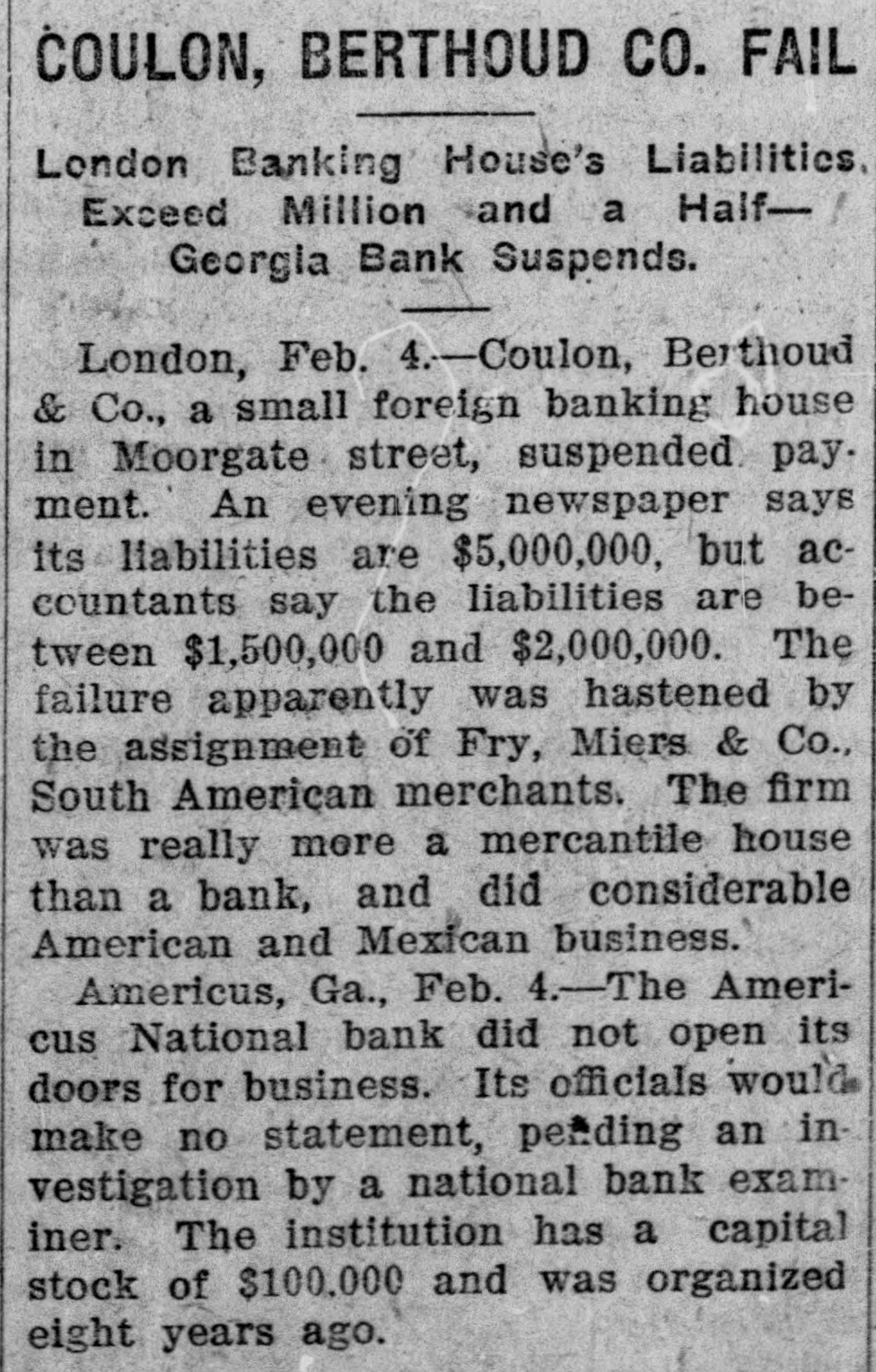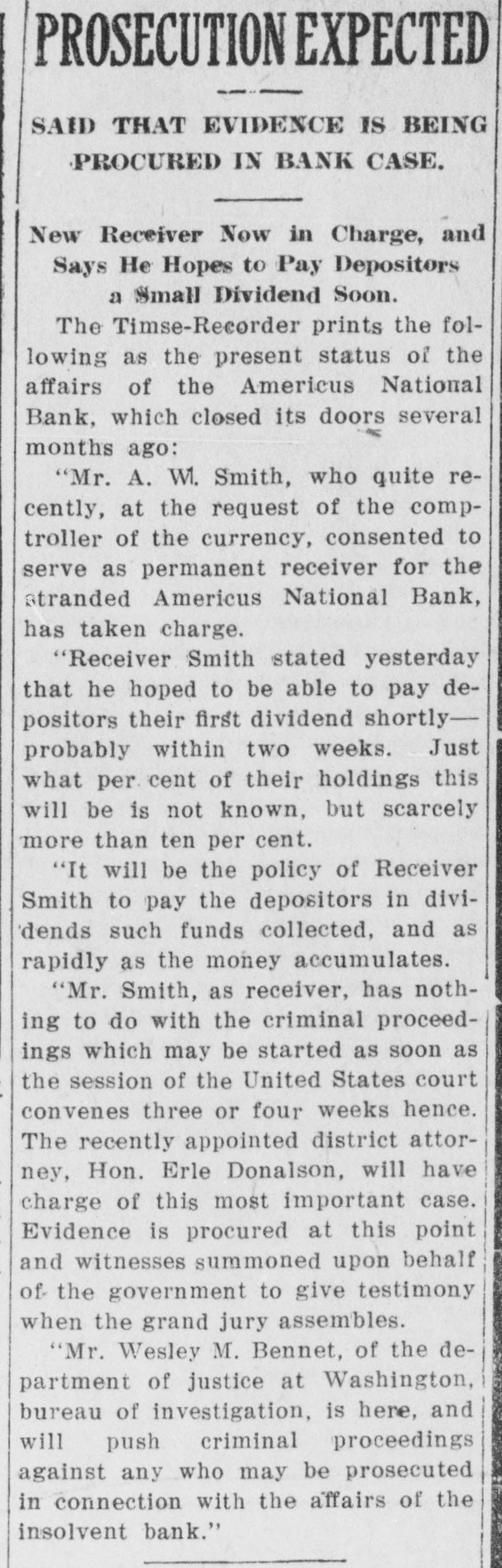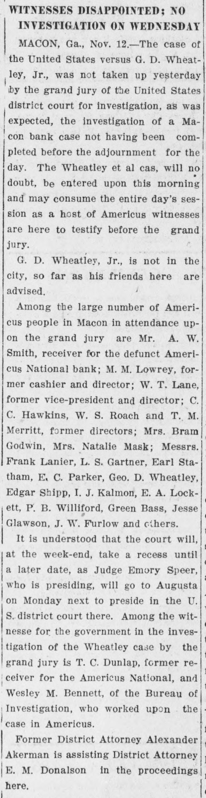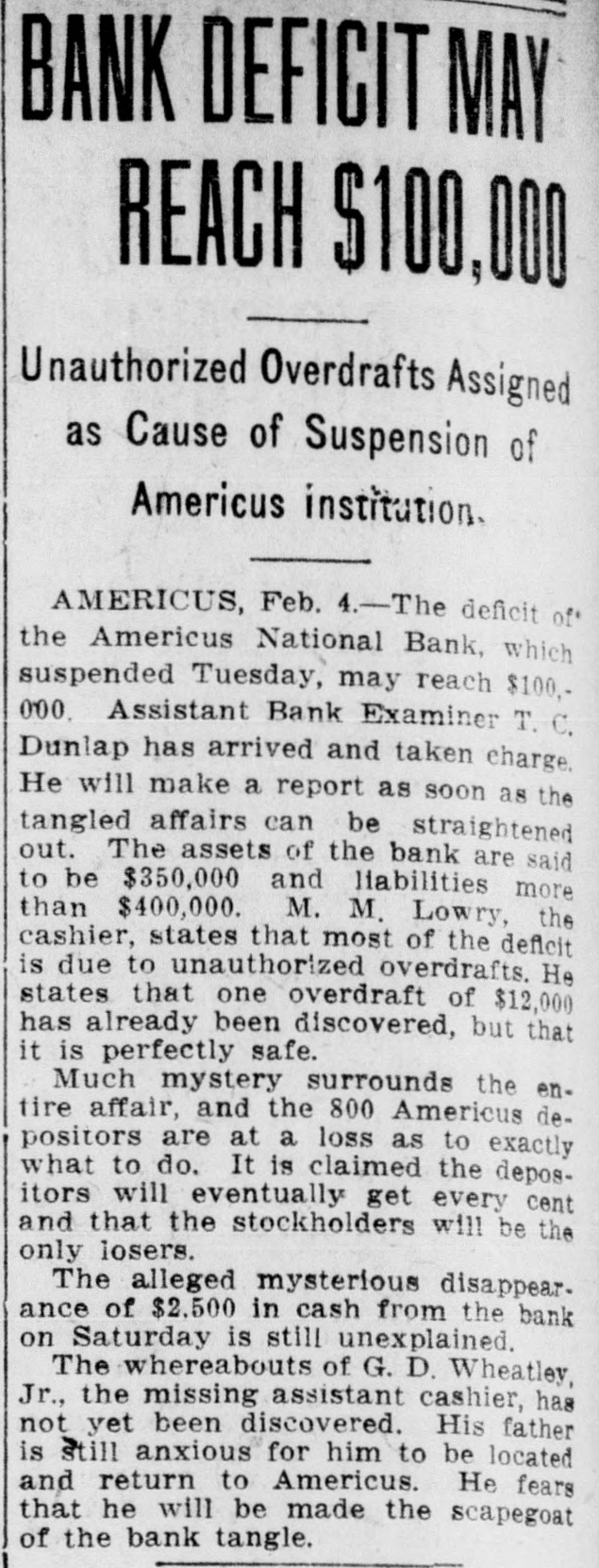 RECEIVERS WILL ADJUST AFFAIRS INSOLVENT BANK 48 part belonging to women, children, and people of small means, all of which WALLIS NAMED seems to have vanished within a brief FAIL OTHER PLANS time. The estimate of $600,000 includRECEIVER FOR es the original capital stock of $100,000, which, it seems, was long ago SIGNALLY dissipated and is now utterly worthSAVINGS BANK less. However, there are proven claims DEPOSITORS WILL REAof depositors amounting to $319,000, LIZE SOME PORTION besides unverified deposits of $35,000. OFFSPRING OF NATION'L BANK In addition, there are other items unThe 'swap song' in the affairs of the der this account of $27,000, making a insolvent and somewhat depleted grand total of $381,000. It is said Americus National Bank which went to His Appointment is Made the amounts due other banks will agthe wall early in February, was sung gregate $110,000. Yesterday yesterday when it was announced that The total liabilities, capitulated, are the final proposition made by depositestimated at about $504,000, besides Judge Z. A. Littlejohn at a late ors to the bank's directors for its the capital stock of $100,000, to be hour yesterday appointed Mr. W. P. liquidation, outside the usual channels added. This is supposed to include the Wallis receiver for the Americus Trust employed by the government, had fall"overdrafts" of about $75,000, the & Savings Bank, an offspring of the en flat. This forlorn hope to which greater portion of which is regarded defunct Americus National, and, prior the depositors had clung, has failed as entirely worthless; probably $10,000 to the closing of that bank ,operated signally. to $12,000 being considered collectaby the same officers. The little saving This being true, Receiver T. C. Dunble. bank was organized under a state lap will continue the work, already Notes held by the bank, good and charter, and had a capital stock of fast progressing, toward liquidating indifferent, may approximate $340,000, $15,000. the national bank in the usual mana considerable portion of them being Its deposit account, at the time of ner employed by the government, at deemed collectable. The total differthe closing of the national bank, was which he has been busied since the ence between available assets and liasaid to be about $13,000. Its assets collapse of the institution in Februbilities is about $162,000, it was said at this time are thought to be rather ary. recently by one of the attorneys intersmall. Just what depositors will reQuite recently a last hope was held ested. Of this large amount something ceive in the liquidation of the bank is, out that the bank's directors might be like $130,000 seems unaccounted for, of course, largely a matter of couinduced to liquidate the bank, providaccording to statements of those injecture. ed the stockholders and depositors terested in the bank's affairs. About two weeks ago, Attorney Gencomplied with certain terms suggested, No authentic information has been eral Warren Grice came to Americus and the four Lowery brothers, all of given out by Receiver Dunlap, as this to see about the appointment of a rethem directors, put up $150,000 to that would be contrary to the regulations ceiver for the little state bank, and end. They had previously expressed of his department. proposed the appointment of Mr. L. G. a willingness to lend substantial asWhen the Americus National closed Council to that position. Mr. Council, sistance to this end by putting up real its doors February 3rd, after a most however, found it inexpedienct to acestate to safeguard the party who prosperous seven years career, the cept the position and so notified Judge would liquidate the bank. people of Americus were stupefied with Littlejohn, who has since named Mr. On the showdown recently, however, astonishment. About nine hundred deWallis as the receiver instead. the value of the realty tendered was positors, many of whom, it is said, The exact status of the bank's conconsidered far less than the amount made large deposits over the counter dition will not be known until Reexpected of them, and the liquidation only the day before the failure withceiver Wallis has gone fully into its plan, as suggested, fell flat, It is out the slightest suspicion of impendfinancial affairs. A number of its desaid directors tendered yesterday the ing danger, were appalled. Up to the positors, it is understood, were women sum of $62,500, or less than half the last day and hour, it is said, deposits and children. amount required, hence the liquidaflowed in freely, and the bank was tion plan failed. considered one of the safest in GeorThe result will be that the stockgia. A comparatively small amount holders will be assessed, under the liaof cash was found in its vaults when FARMER A BUSINESS bility clause, and probably $70,000 Receiver Dunlap assumed charge the raised from that source. The stocknext day. The work of depletion had MAN THANKS TO holders' liability is $100,000, but some been terribly complete. of them are unable to pay. This To this bank hundreds of people, amount, with that to be laboriously RURAL PHONES some of them widows, had been atcollected from the assets of the bank, tracted by the alluring rates of intergood, bad and indifferent, will be disAtlanta, May 30.-Rural telephones est offered, and the belief that their are beignning to play just as importtributed as far as it will go in the money would be absolutely safe in a payment of the bank's indebtedness ant if not a more important part than national bank. Merchants, farmers and deposit account. either rural free delivery or parcels and others deposited there. Many post, in putting the farmer on an econJust what depositors will eventually poor people who had saved a pittance omic equality with the city business receive is a mooted question. No estifor their declining years, had their man. mate is given out by those in authority little hoard swept away-just how The growth of rural telephones or and guess