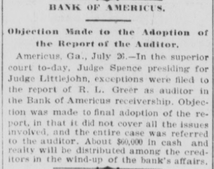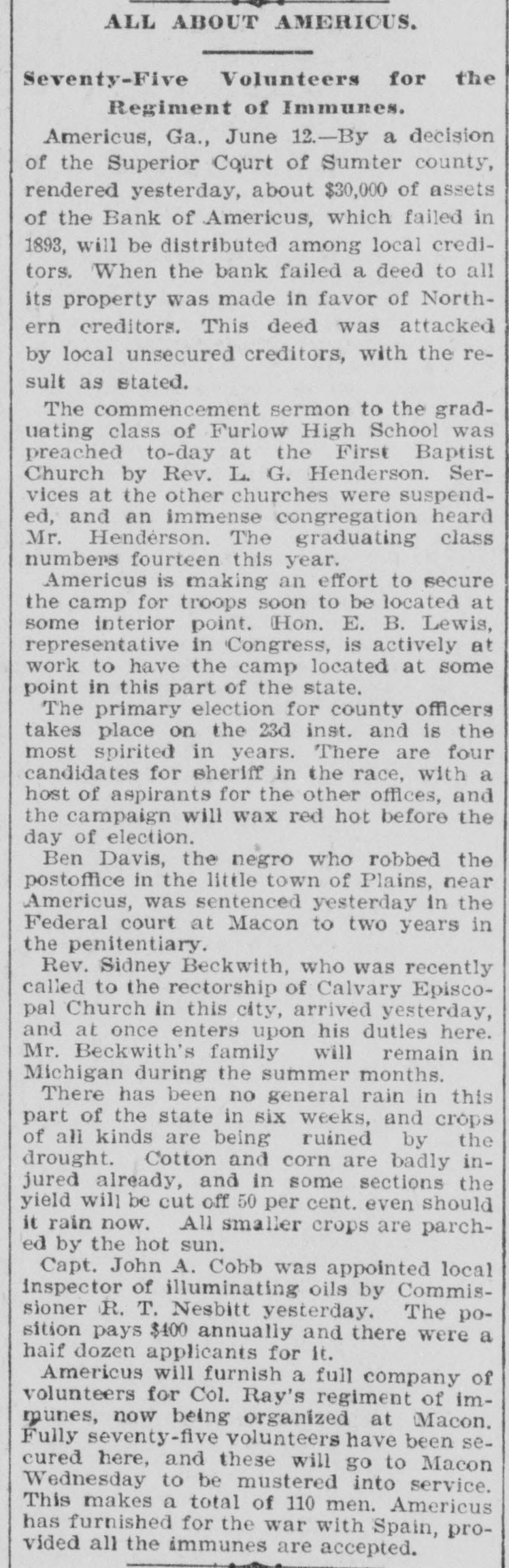 ALL ABOUT AMERICUS. Seventy-Five Volunteers for the Regiment of Immunes. Americus, Ga., June 12.-By a decision of the Superior Court of Sumter county, rendered yesterday, about $30,000 of assets of the Bank of Americus, which failed in 1893, will be distributed among local creditors. When the bank failed a deed to all its property was made in favor of Northern creditors. This deed was attacked by local unsecured creditors, with the result as stated. The commencement sermon to the graduating class of Furlow High School was preached to-day at the First Baptist Church by Rev. L. G. Henderson. Services at the other churches were suspended, and an immense congregation heard Mr. Henderson. The graduating class numbers fourteen this year. Americus is making an effort to secure the camp for troops soon to be located at some interior point. Hon. E. B. Lewis, representative in Congress, is actively at work to have the camp located at some point in this part of the state. The primary election for county officers takes place on the 23d inst. and is the most spirited in years. There are four candidates for sheriff in the race, with a host of aspirants for the other offices, and the campaign will wax red hot before the day of election. Ben Davis, the negro who robbed the postoffice in the little town of Plains, near Americus, was sentenced yesterday in the Federal court at Macon to two years in the penitentiary. Rev. Sidney Beckwith, who was recently called to the rectorship of Calvary Episcopal Church in this city, arrived yesterday, and at once enters upon his duties here. Mr. Beckwith's family will remain in Michigan during the summer months. There has been no general rain in this part of the state in six weeks, and crops of all kinds are being ruined by the drought. Cotton and corn are badly injured already, and in some sections the yield will be cut off 50 per cent. even should it rain now. All smaller crops are parched by the hot sun. Capt. John A. Cobb was appointed local inspector of illuminating oils by Commissioner R. T. Nesbitt yesterday. The position pays $400 annually and there were a half dozen applicants for it. Americus will furnish a full company of volunteers for Col. Ray's regiment of immunes, now being organized at Macon. Fully seventy-five volunteers have been secured here, and these will go to Macon Wednesday to be mustered into service. This makes a total of 110 men. Americus has furnished for the war with Spain, provided all the immunes are accepted.